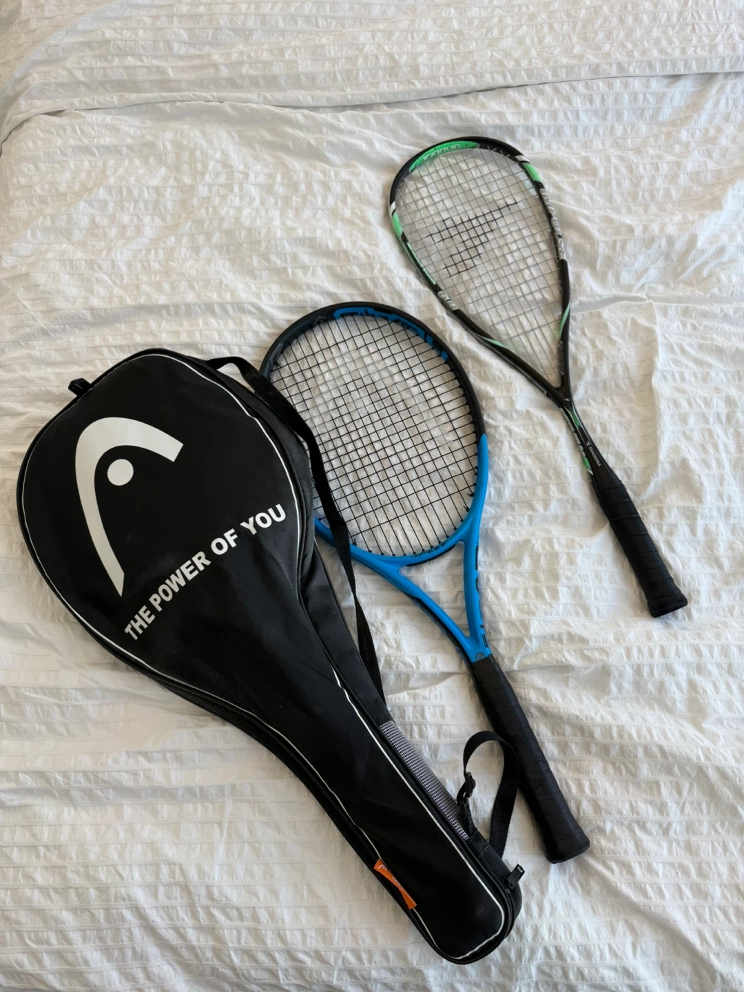 Selling a Head tennis and Diadora squash rackets. Includes a blue tennis racket, a green squash racket, and a Head carrying bag. Great for anyone looking to get into racquet sports!