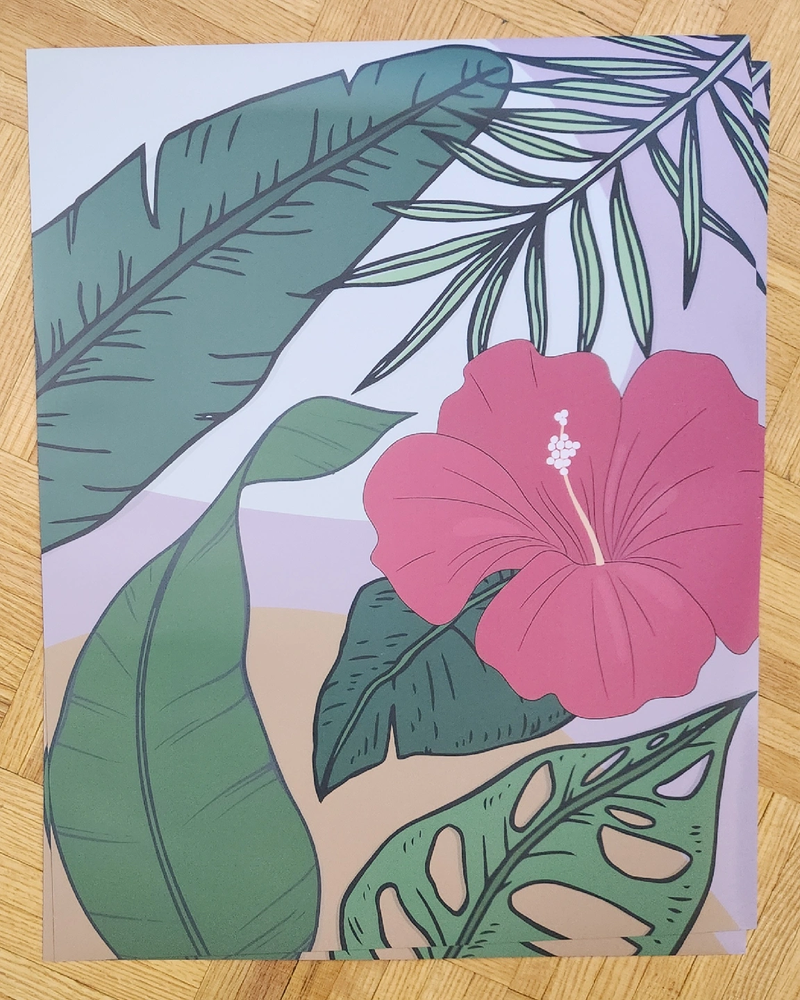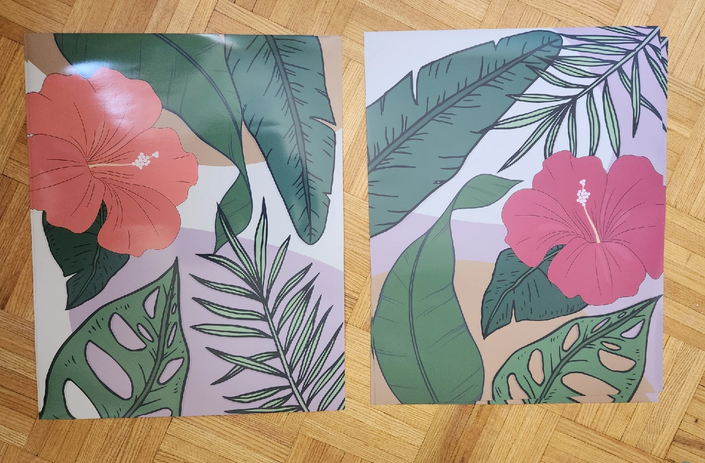 Poster Set of two tropical-themed prints featuring vibrant hibiscus flowers and lush green foliage. These would be perfect for adding a pop of colour to any room!