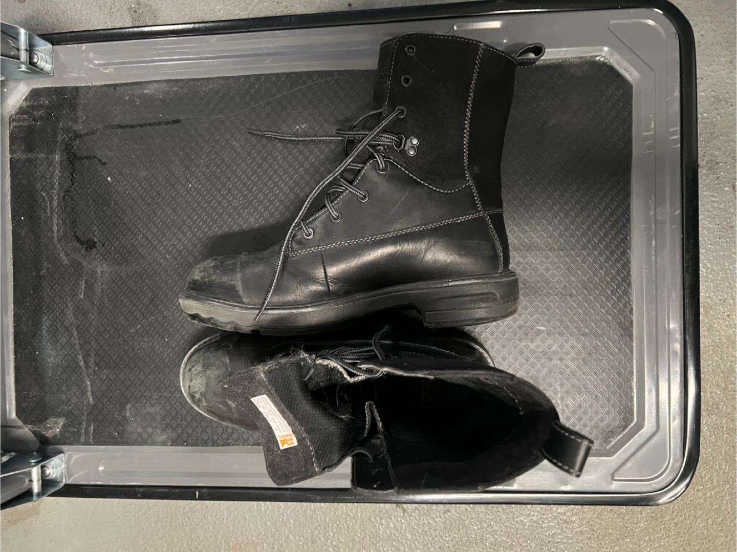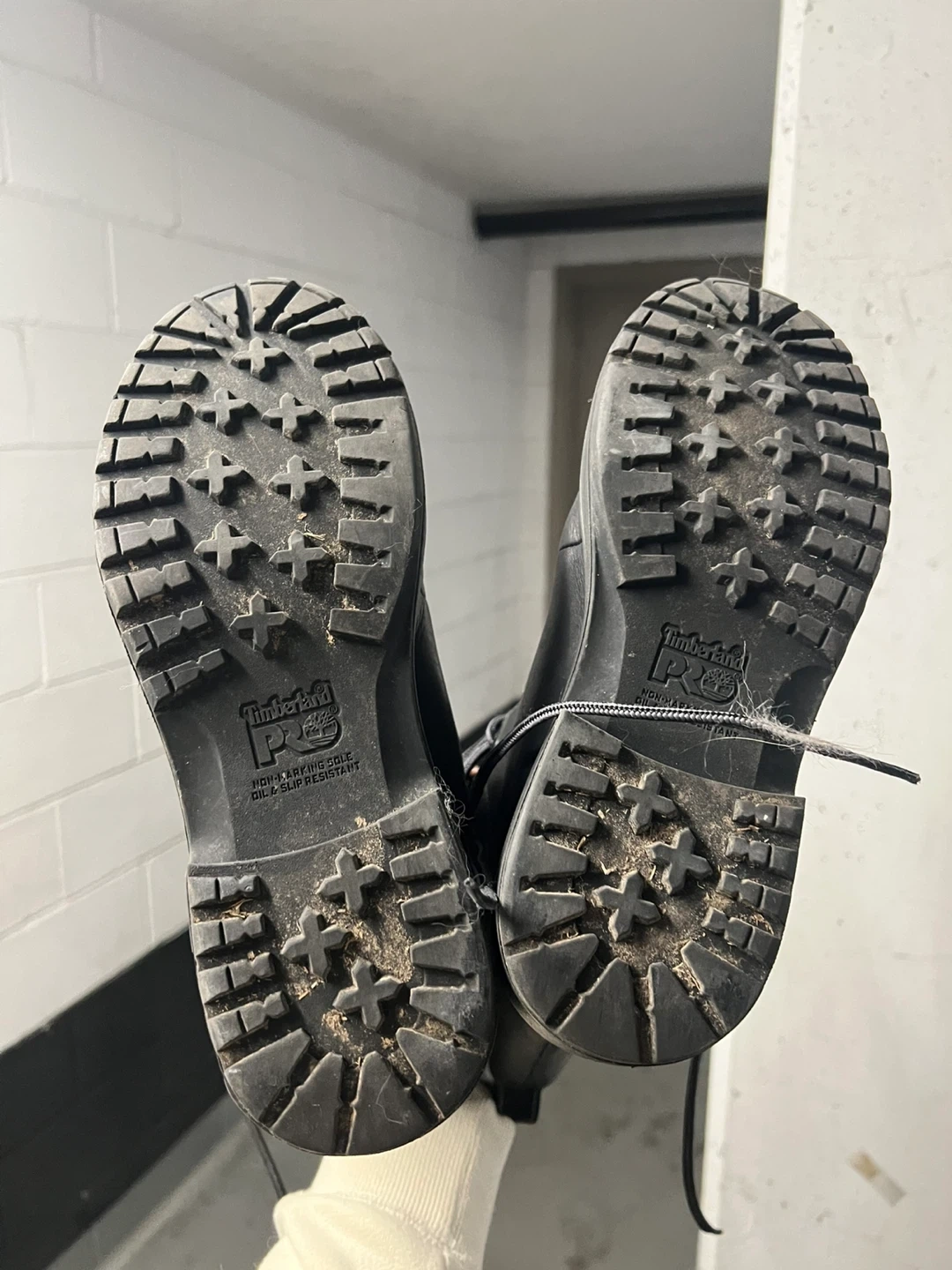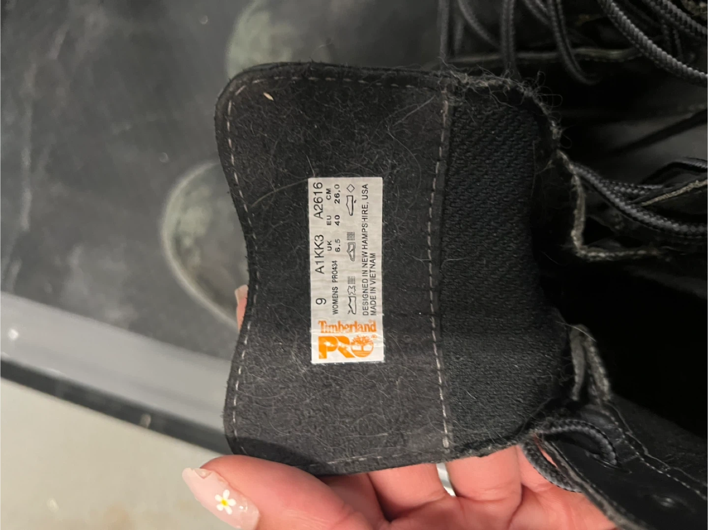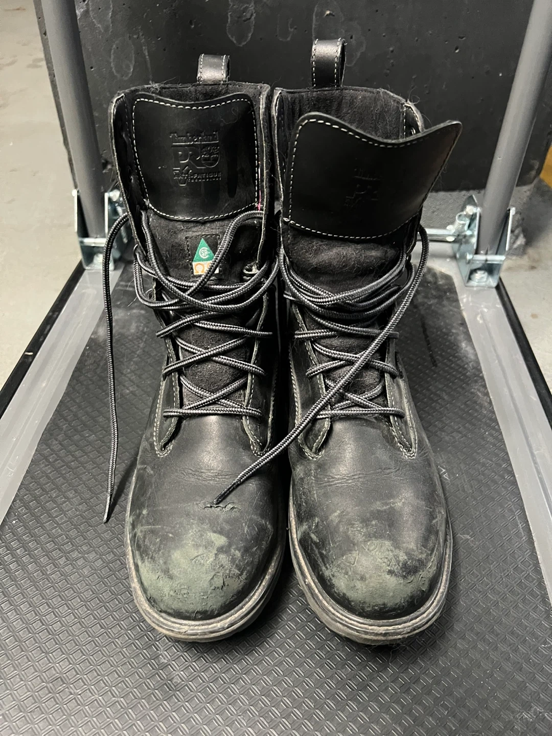 Selling a pair of Timberland PRO women's STEEL TOE work boots, model A1KK3 in size 9. These are sturdy and reliable boots, perfect for tough jobs. They show some signs of wear, but are still in good condition and ready for a new owner!