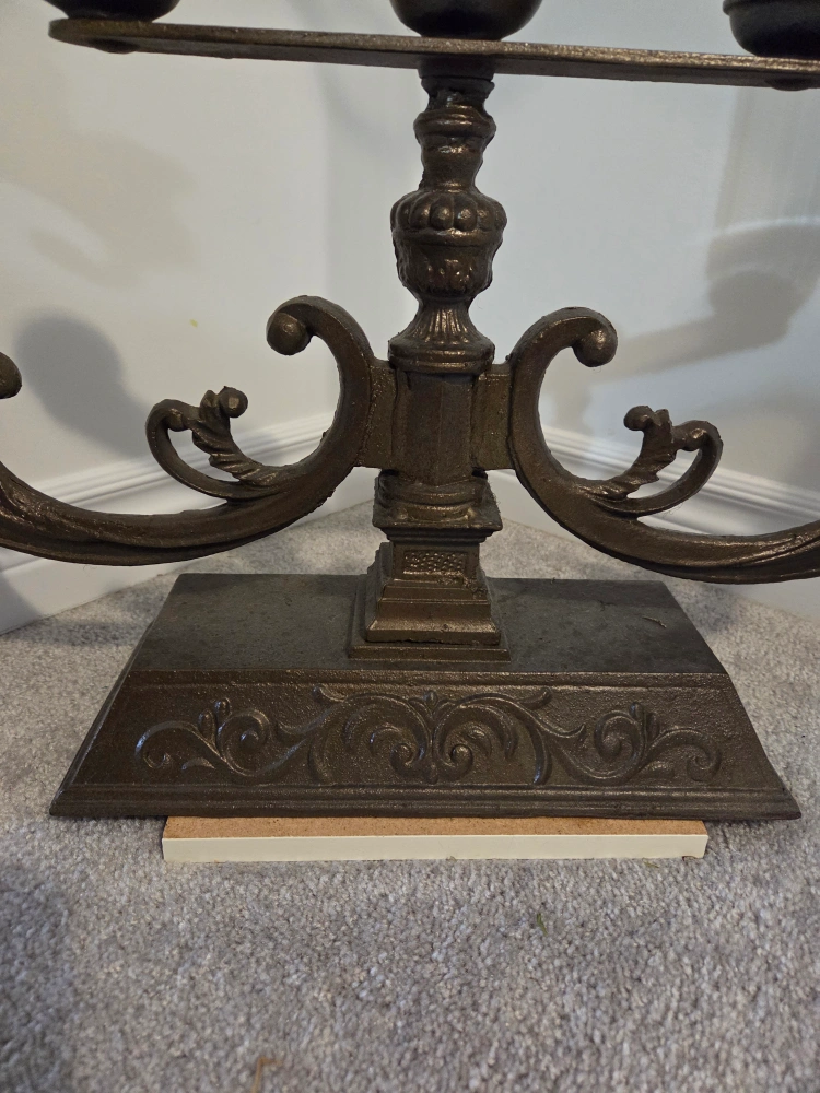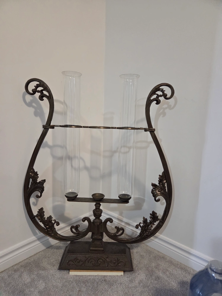 Selling a vintage Art Nouveau style French cast iron plant stand. It has a beautiful, ornate design and includes glass tubes for plants. The original listing price was CA$1,500