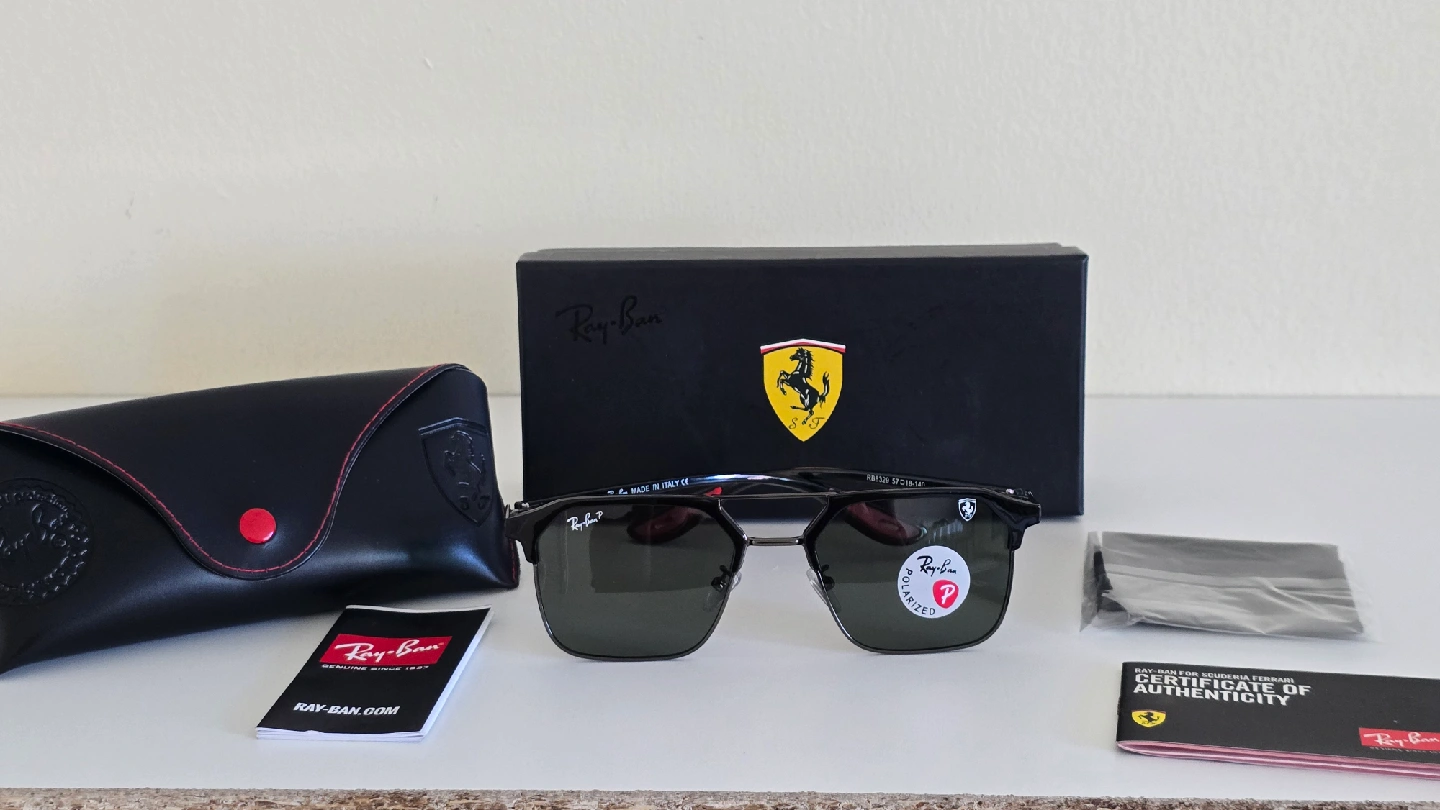 Selling a pair of Ray-Ban sunglasses in black, featuring the Ferrari logo. They come with the original box, case, and certificate of authenticity. These stylish sunglasses are perfect for adding a touch of sophistication to any outfit