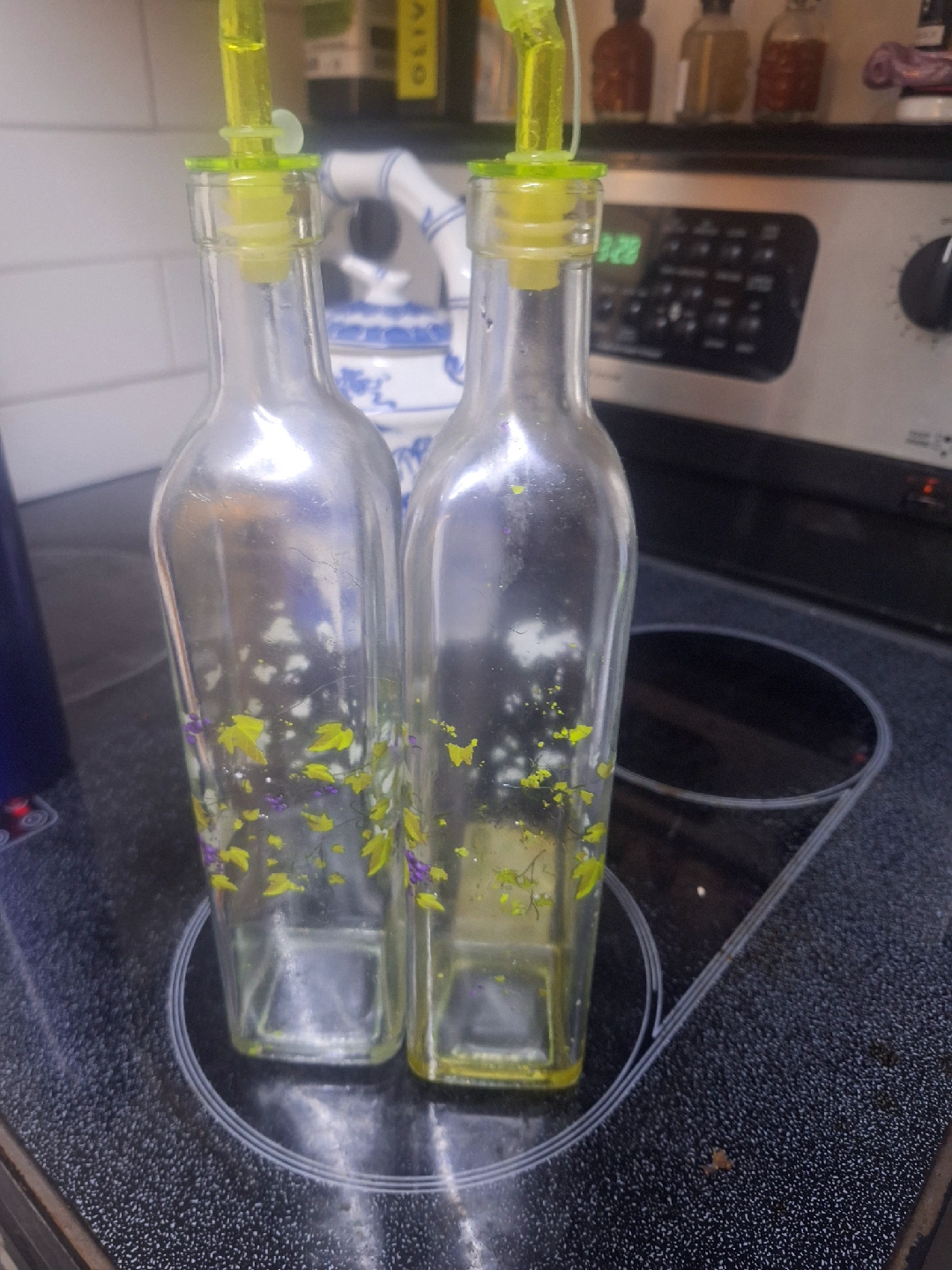 two olive oil dispenser bottles! They have a cute floral design and are perfect for adding a touch of charm to your kitchen. Great for dispensing olive oil, vinegar, or other liquids while cooking or serving