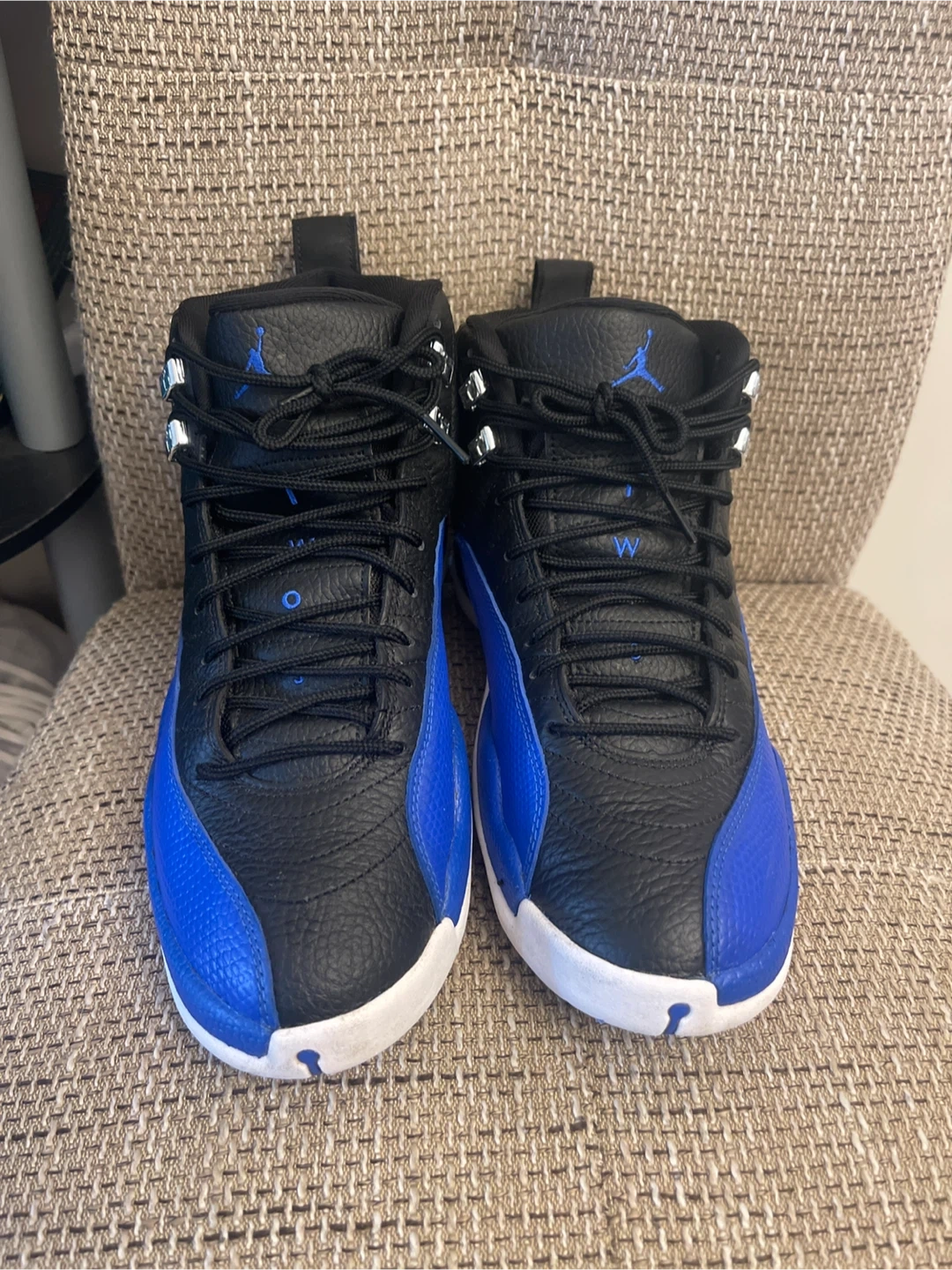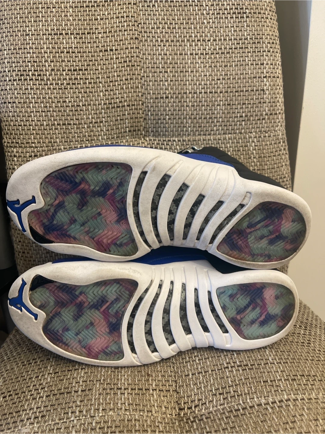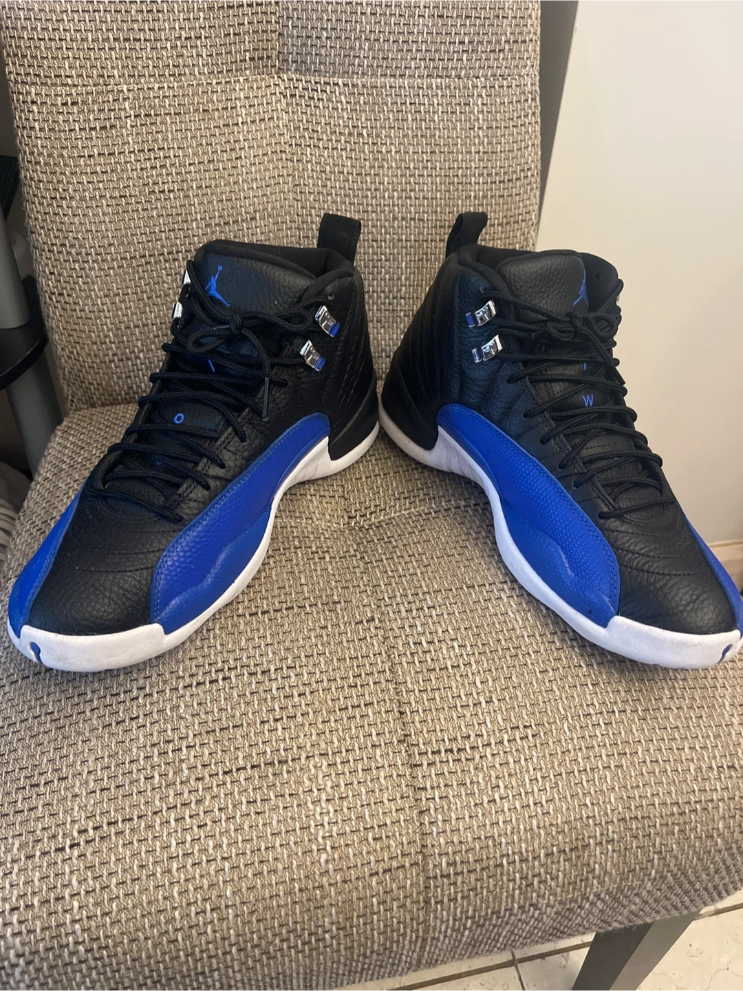 Selling a pair of Air Jordan 12 Retro sneakers in black and royal blue. These shoes are in great condition and feature the classic design with the number 23 on the heel. Woman’s size 11 (Men’s size 9.5)