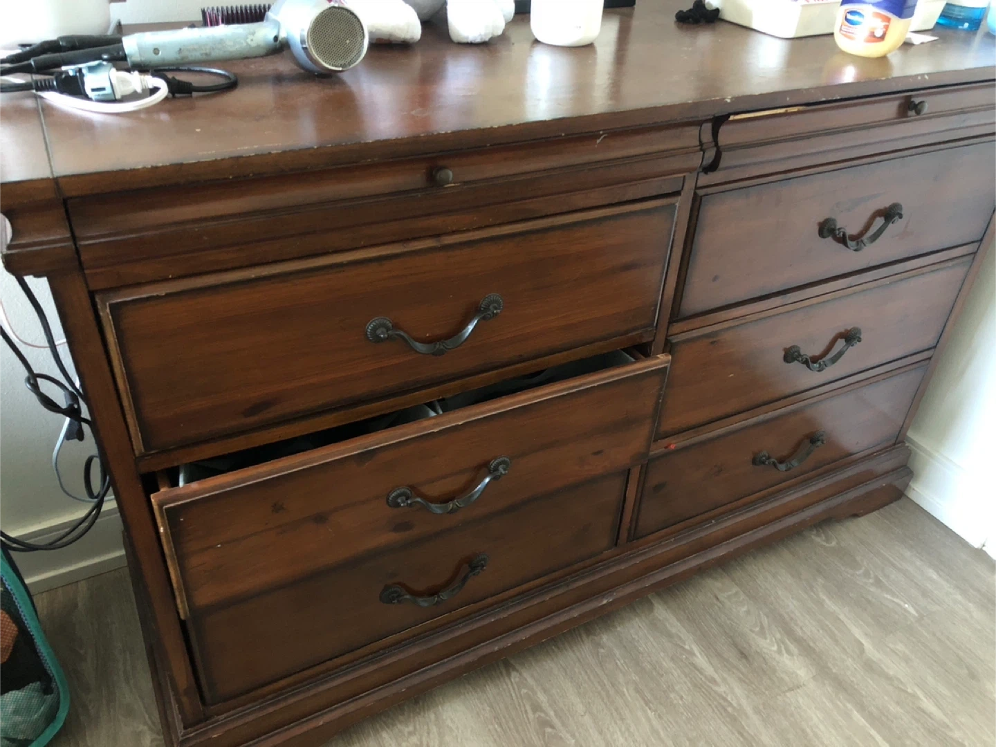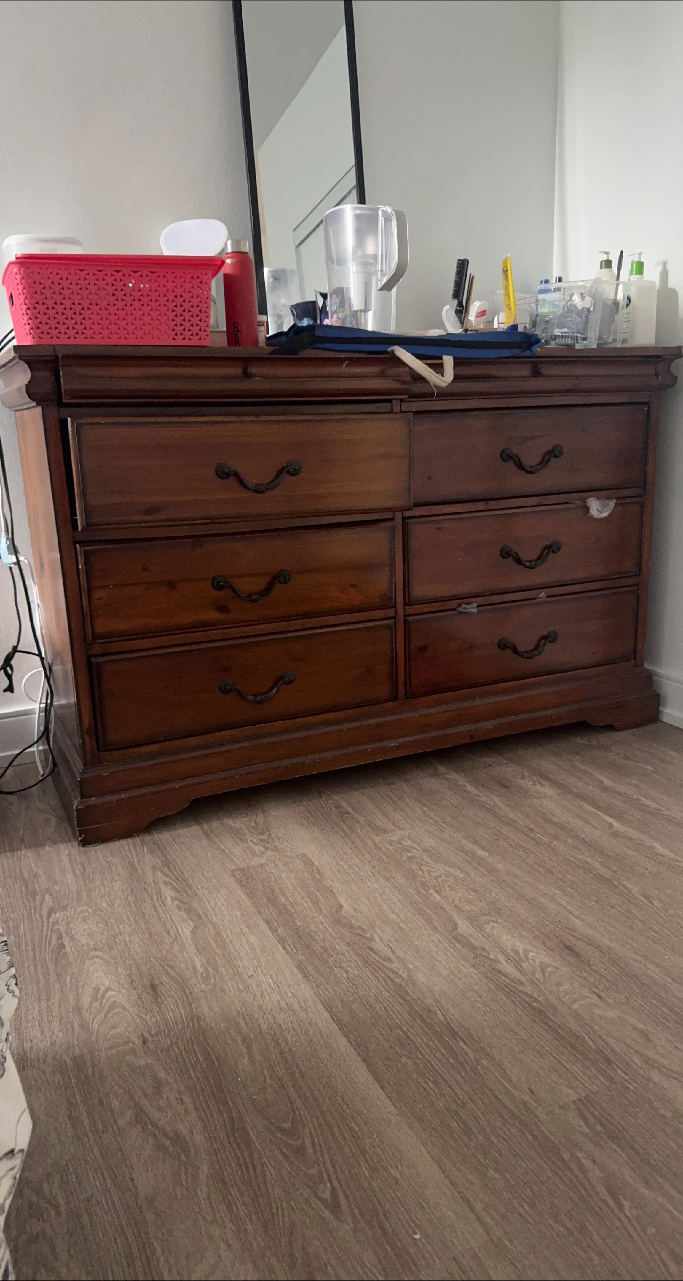Here's a wooden dresser with six drawers. It has a brown finish and classic handles. There are some signs of wear, as shown in the pictures, but it's still a functional piece of furniture for your home.