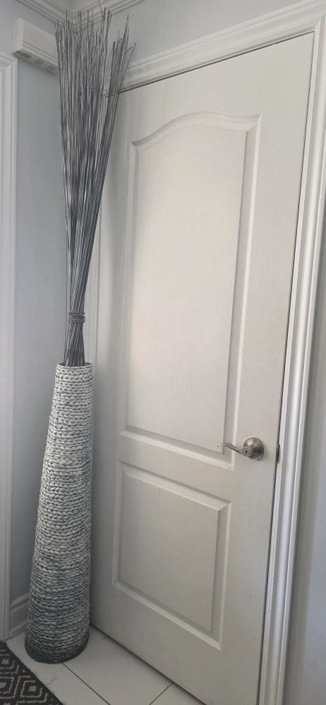 A stylish floor vase with decorative sticks to add a touch of elegance to your home! The vase has a woven texture and a unique design that will complement any room. It's in great condition and ready to find a new home