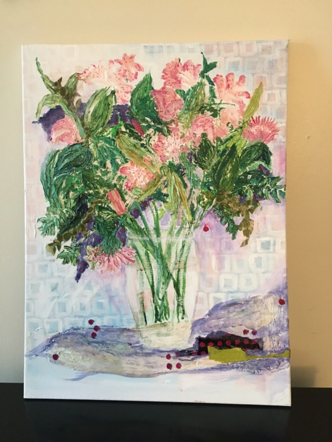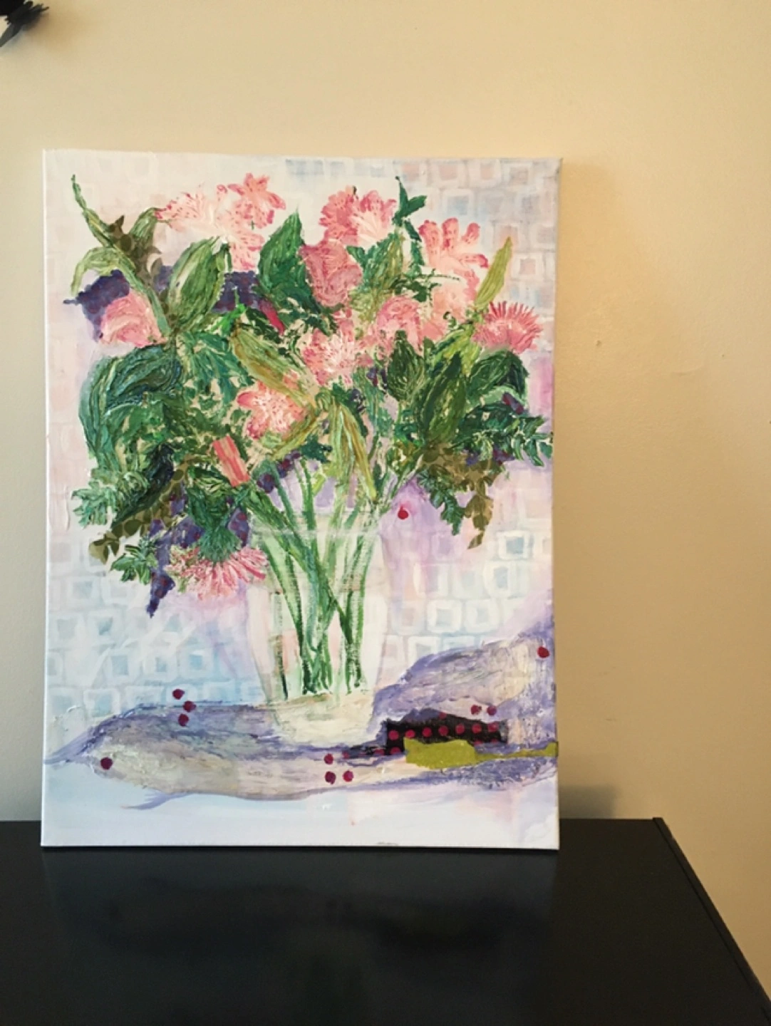 Lovely floral painting, perfect for adding a touch of colour to any room! The painting measures approximately 24 inches in height and 18 inches in width. It's in great condition and ready to be displayed