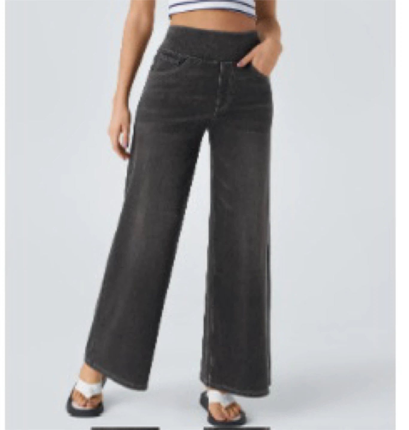 Selling blue wide leg pull-on jeans. They're a stylish and comfy choice for everyday wear! The dark wash denim is super versatile, and the wide leg design is right on trend.