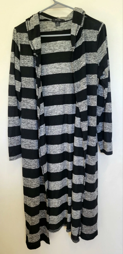 Selling a Majora hooded cardigan in a size L/G. It features a black and grey striped pattern and is in good condition. Perfect for layering!