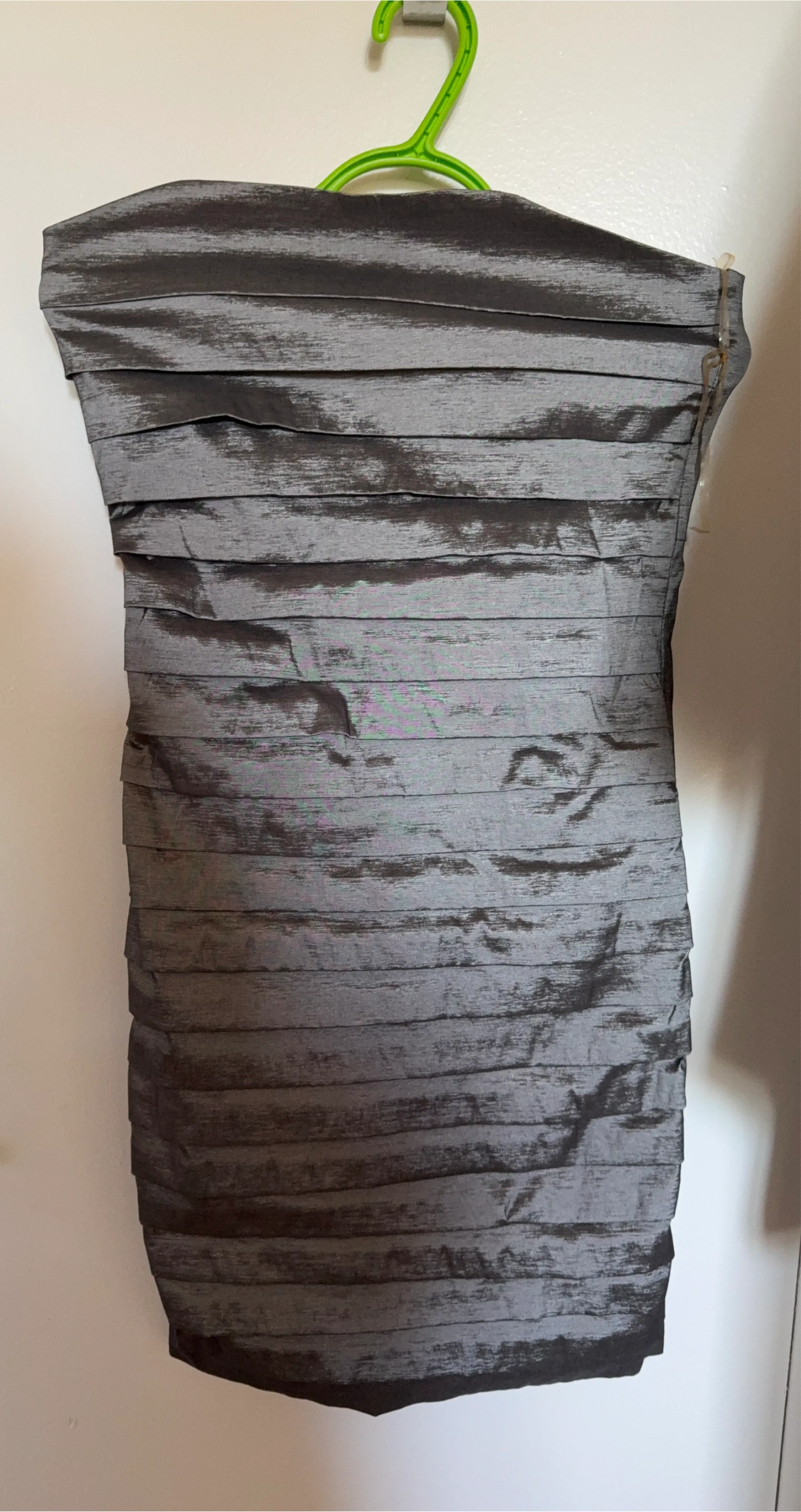 Here's a stylish grey party dress with a unique layered design! It's perfect for a night out or a special occasion. The dress is in great condition and ready for a new home