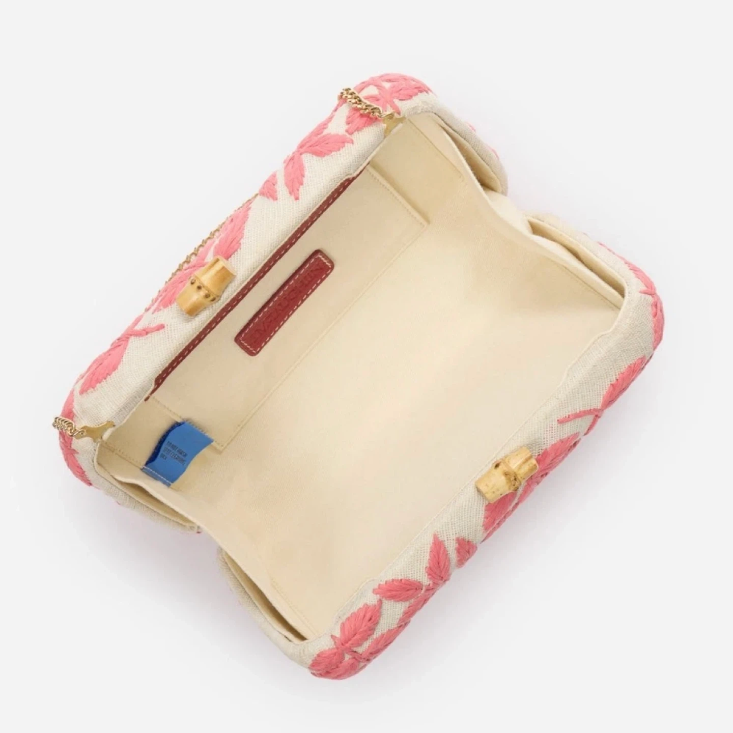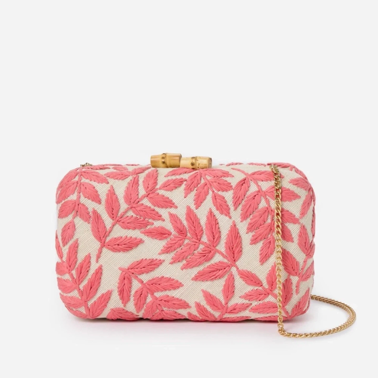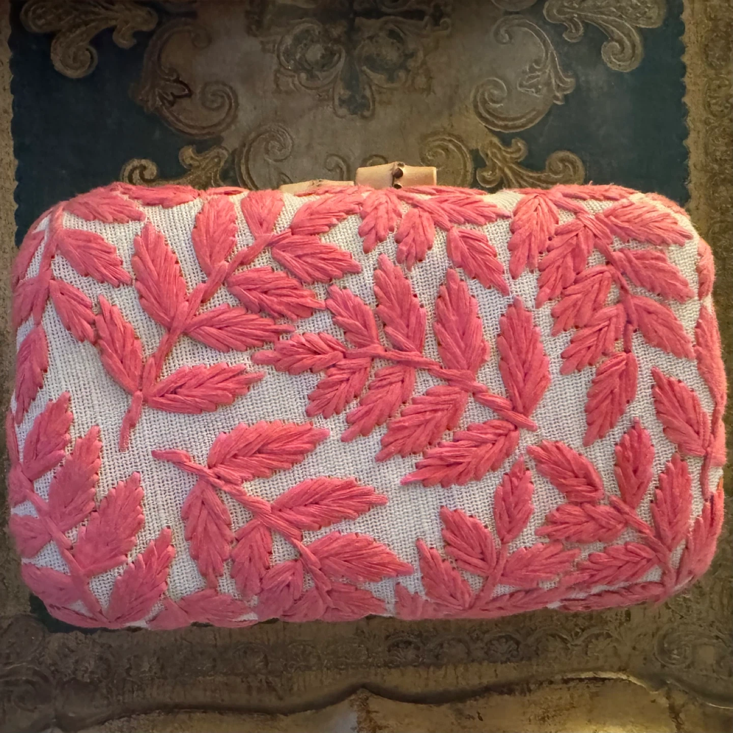 Retails for $200. New, never used. This is a J. McLaughlin Pink Embroidered Clutch featuring a beautiful leaf pattern in pink on a natural-colored background. It has a bamboo clasp and a delicate gold chain. Perfect for adding a touch of elegance to any outfit!