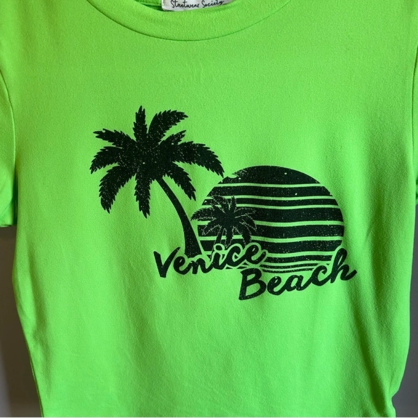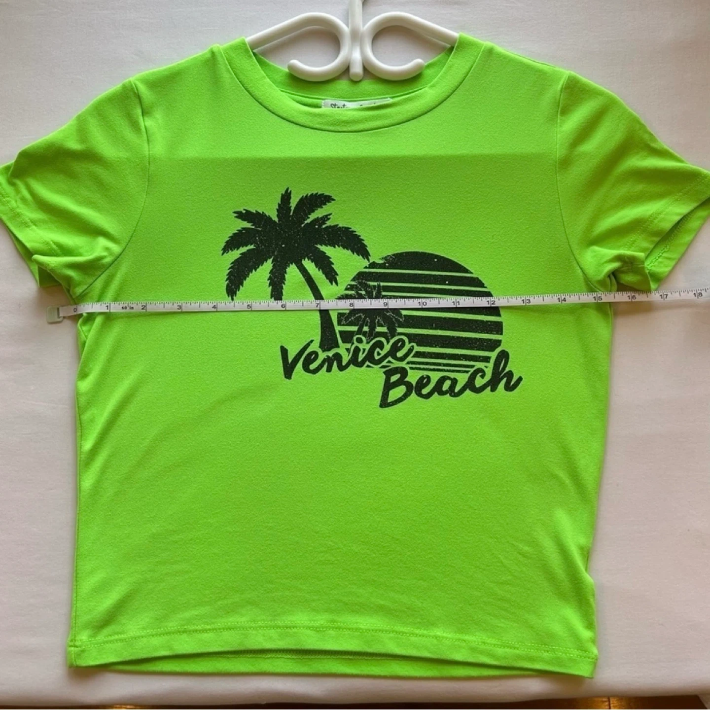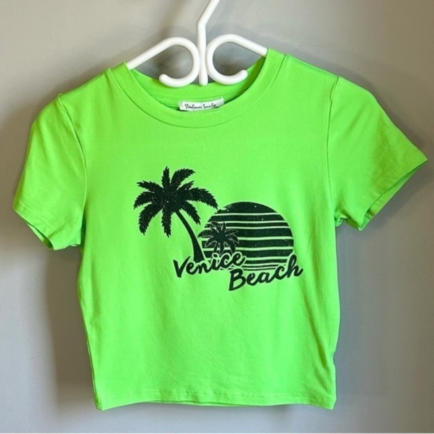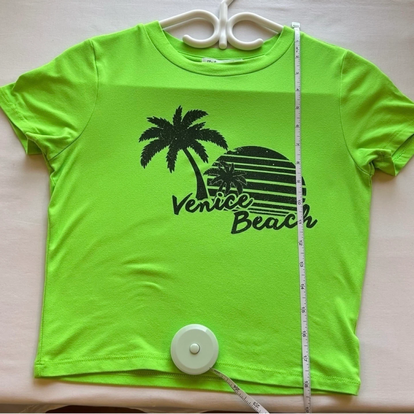 Neon Green short sleeve cropped t-shirt from Streetwear Society. Very soft comfortable material. Crew neck. Venice Beach printed on chest. Care tag has been cut out but brand and size tags still intact. Very tiny mark on front (pictured) can hardly see it, otherwise it’s in great condition. Women’s size M. See photos for measurements. Cross posted.