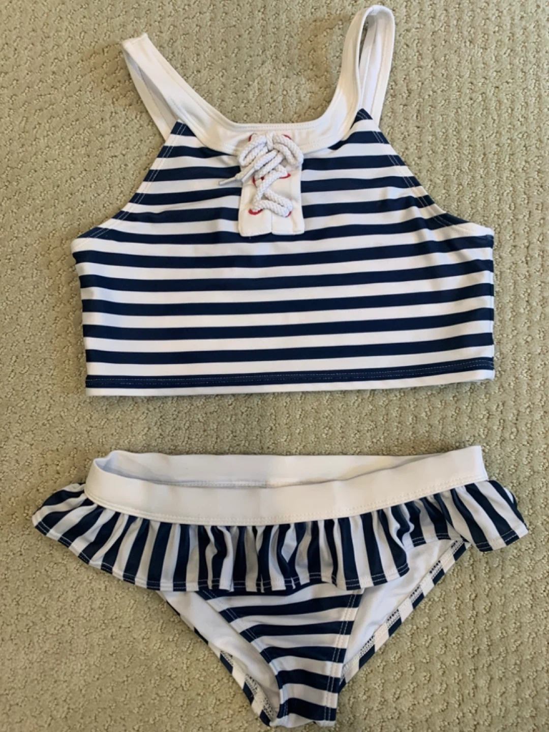 Selling a cute Gymboree girls' swimsuit in size 10. It features a stylish striped design in navy and white. The material is 87% polyester and 13% spandex, making it comfortable and stretchy for swimming and playing at the beach or pool