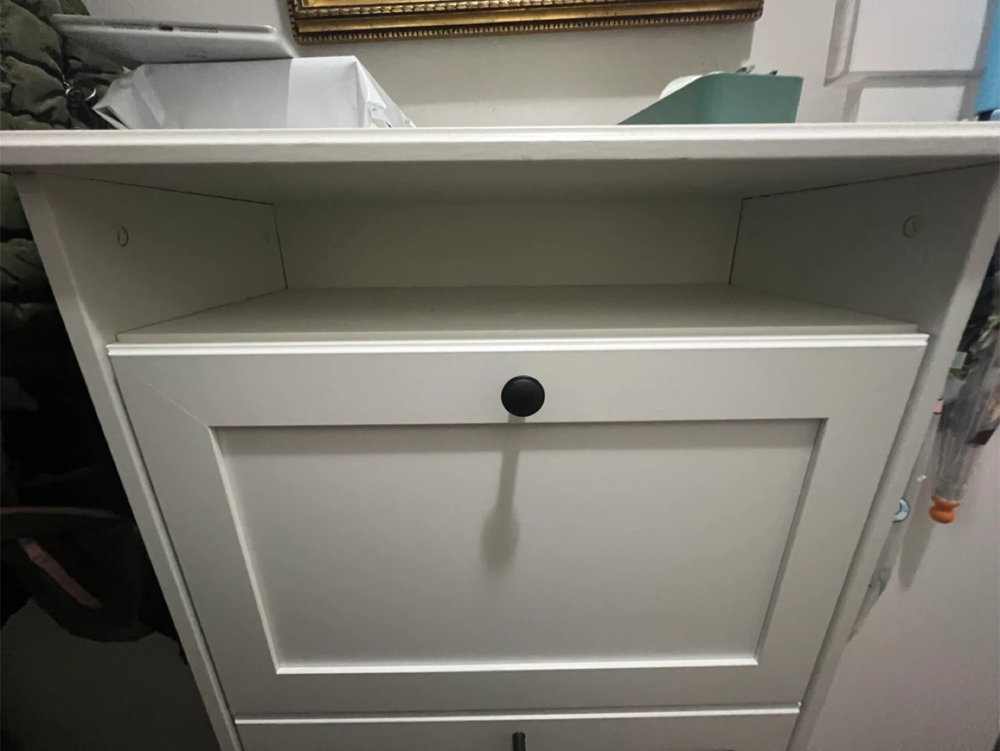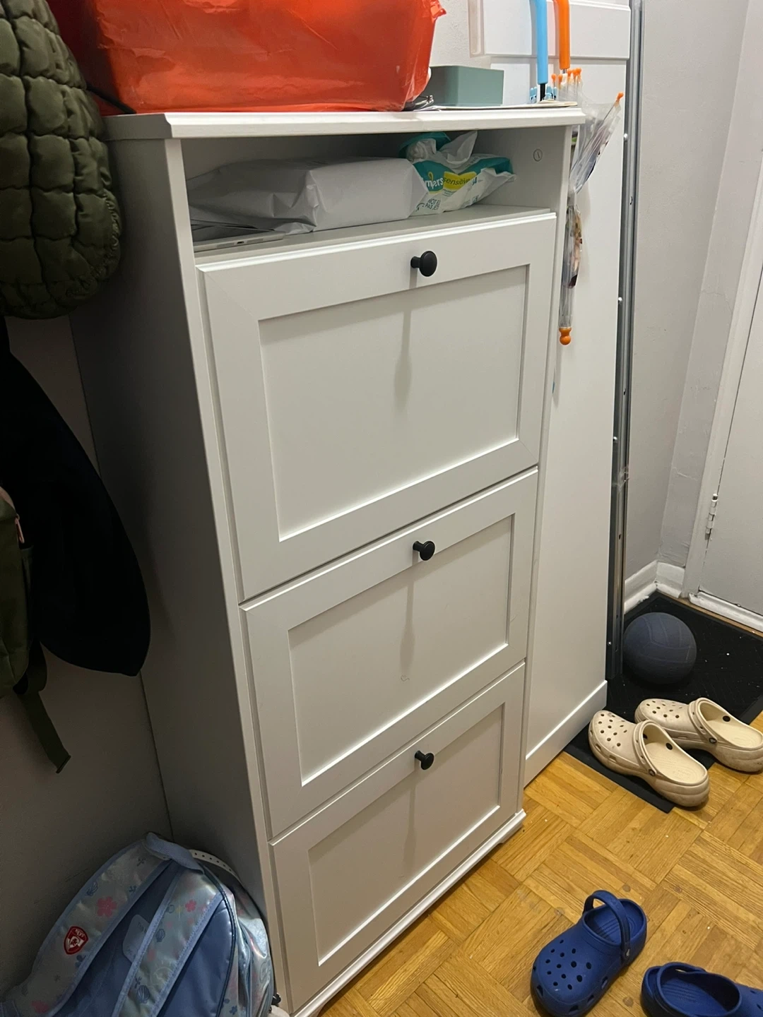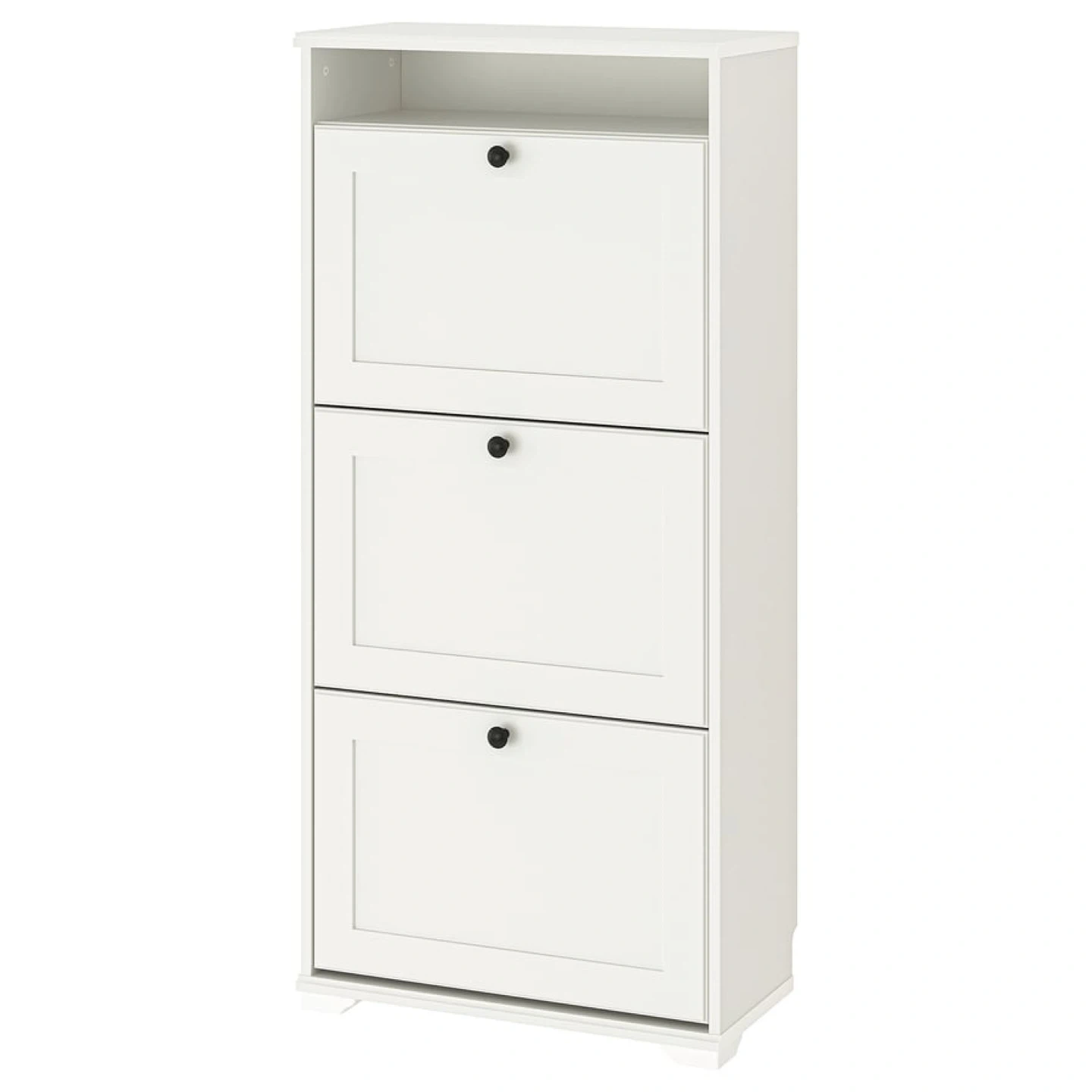 Selling IKEA Brusali shoe cabinet in white! It's in great condition and ready to organize your footwear. This cabinet has 3 compartments for shoes and a top shelf for other items.