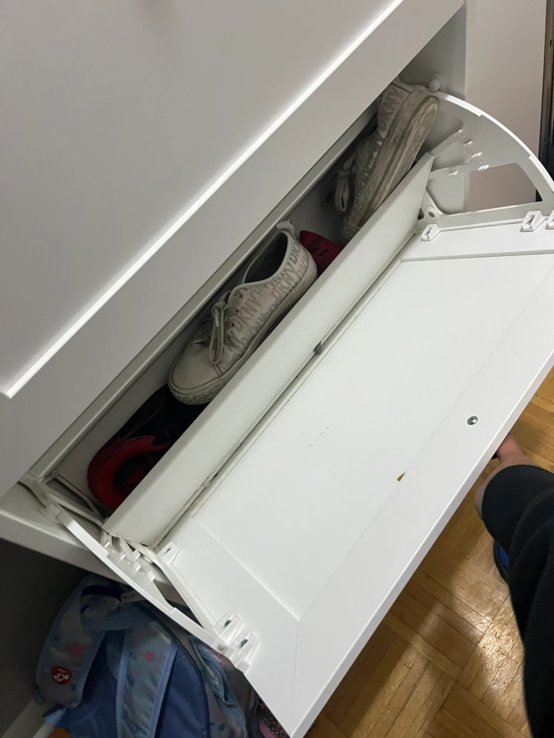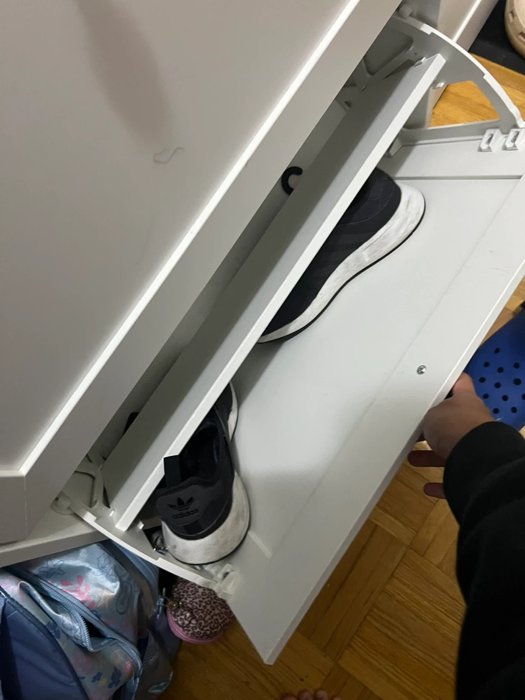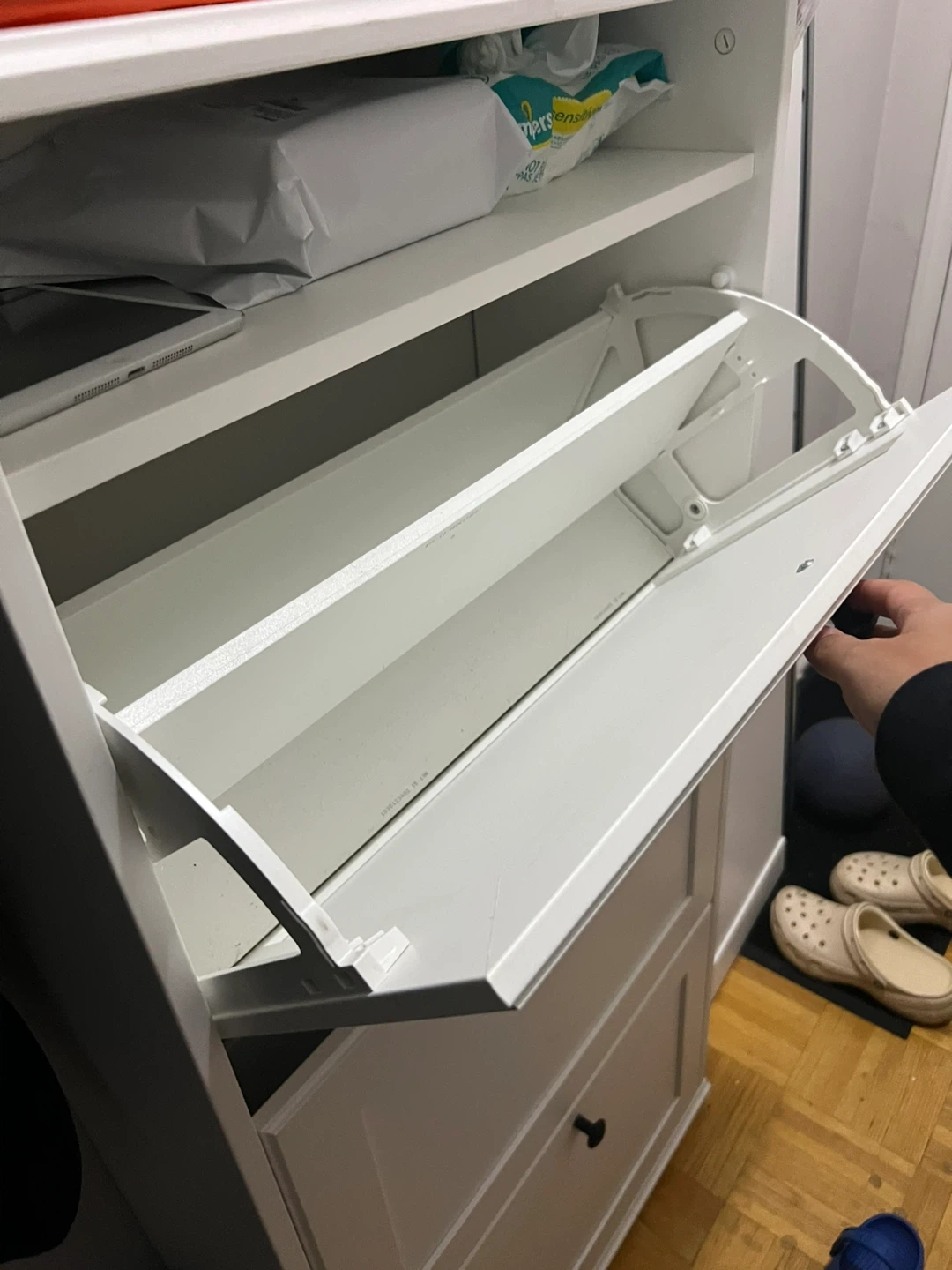 Selling IKEA Brusali shoe cabinet in white! It's in great condition and ready to organize your footwear. This cabinet has 3 compartments for shoes and a top shelf for other items.