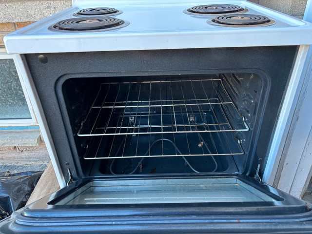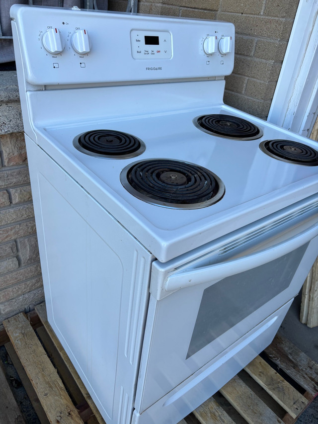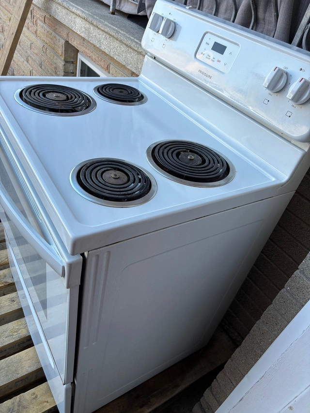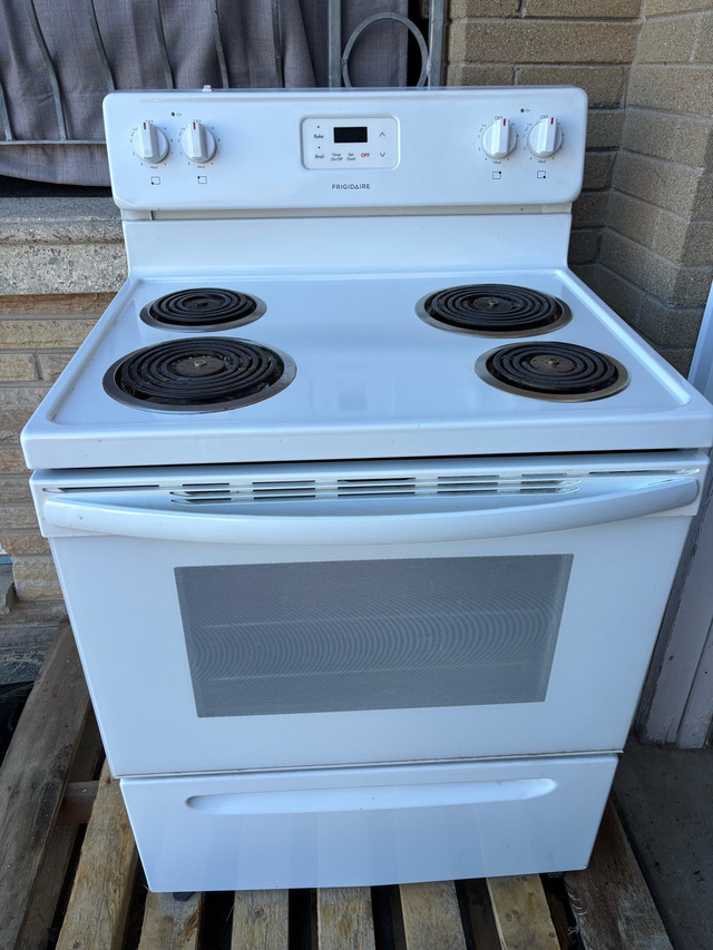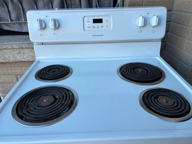 This is a used Frigidaire stove with coil top elements. It's in good working condition, perfect for anyone looking for a reliable and straightforward appliance. It has the usual marks of use, but nothing that affects its performance. Specifications: * Brand: Frigidaire * Type: Electric Stove * Top: Coil Elements * Colour: White