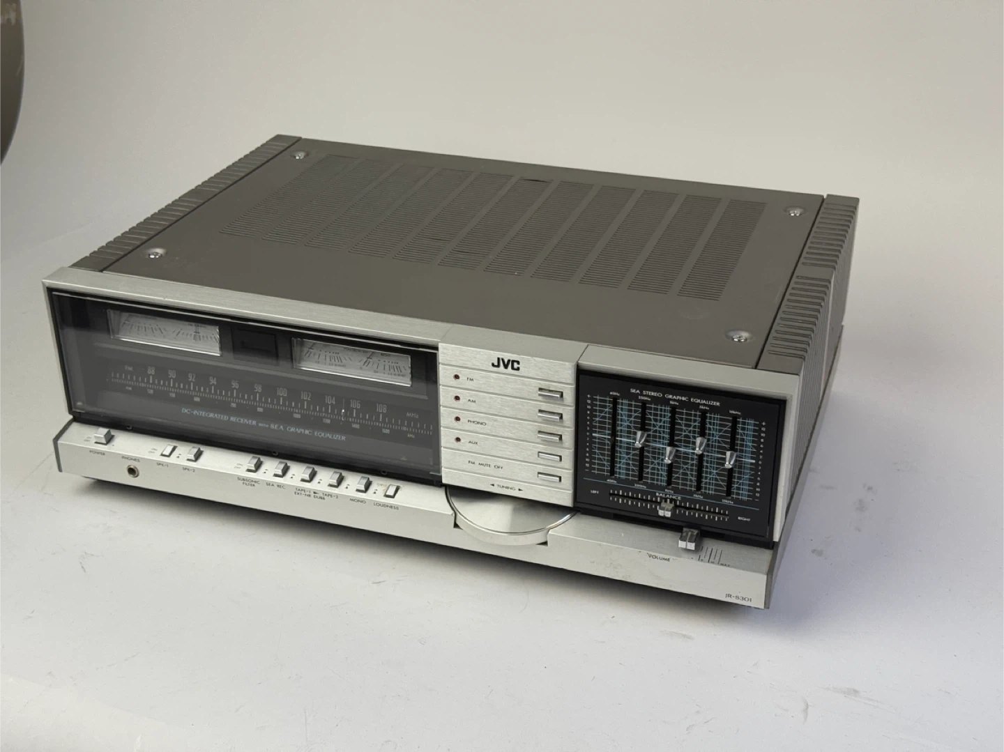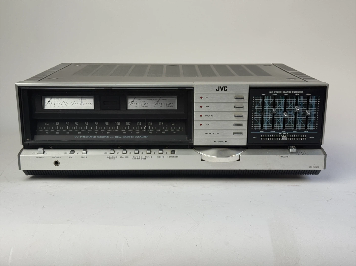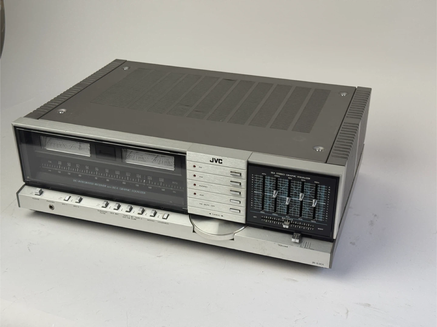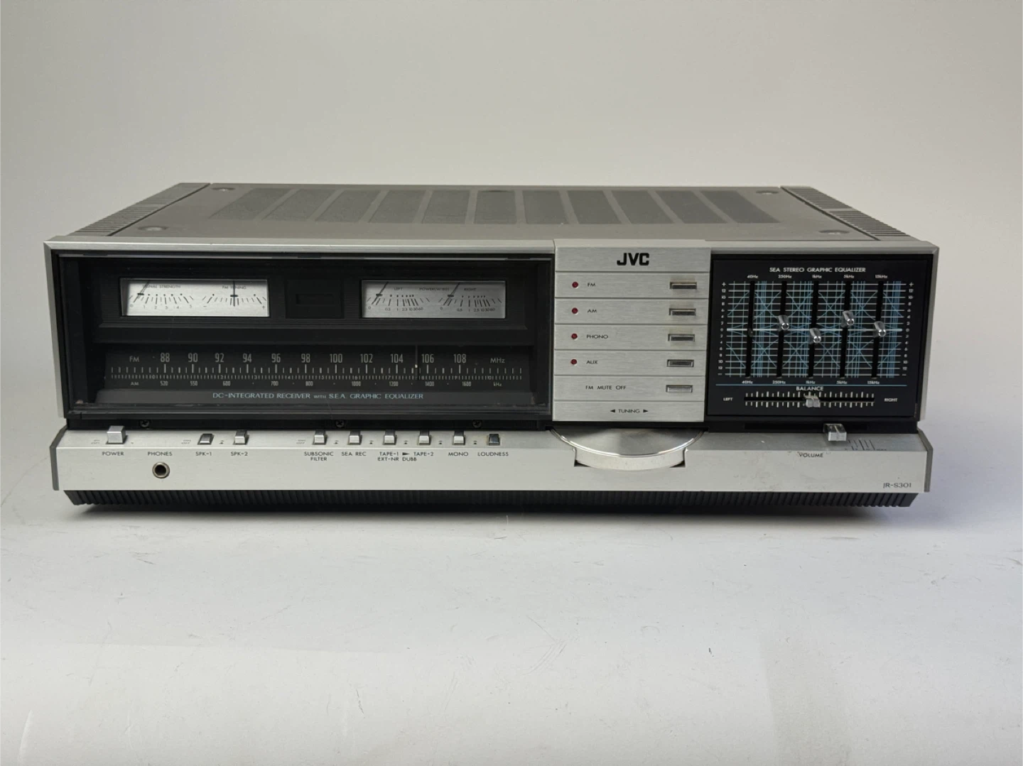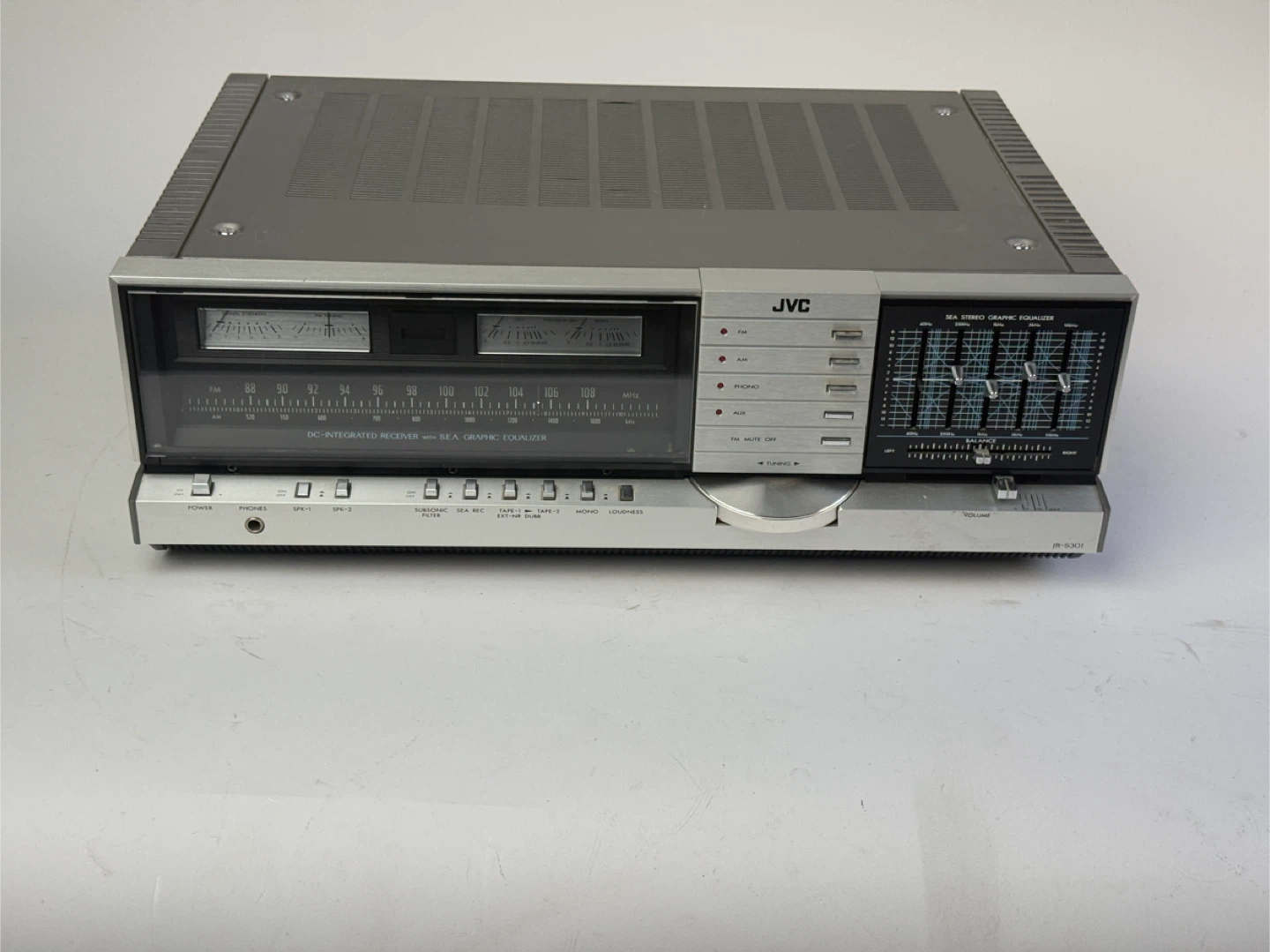 Selling a vintage JVC JR-S301 stereo receiver! This unit features a DC-integrated receiver with a SEA graphic equalizer. It's a classic piece of audio equipment that would be great for any vintage audio enthusiast. It has some signs of use but is in overall good condition