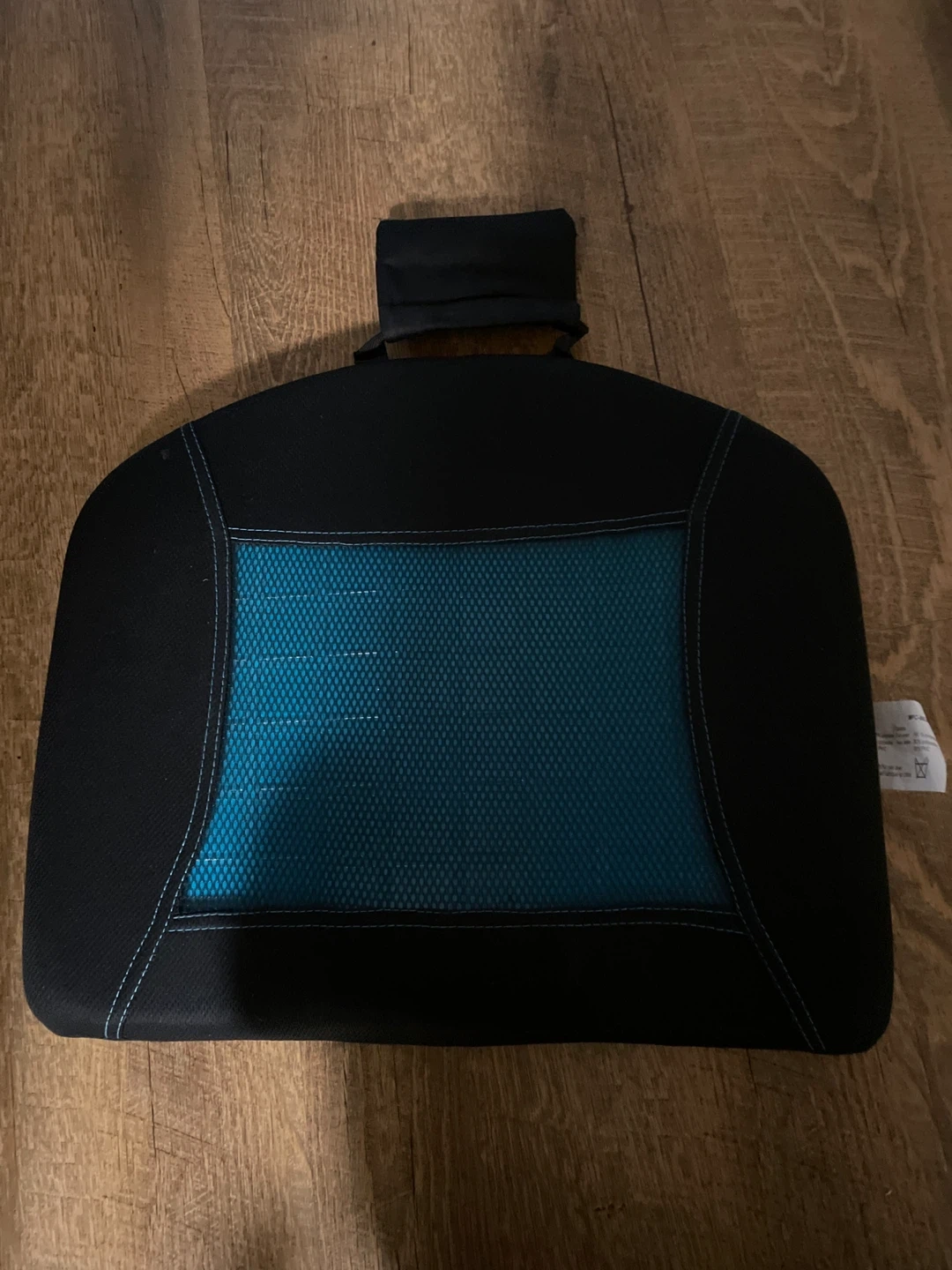 cushion with a black border and a blue mesh center. It has a black strap at the top to secure it to the seat. It is in good condition and ready for a new home