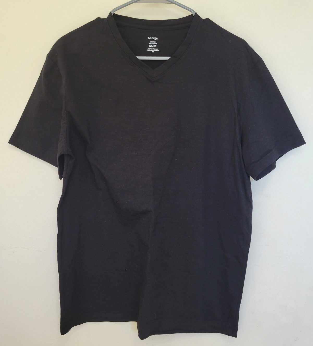Selling a black V-neck t-shirt from George in size medium. It's in great condition and made with stretch material for a comfortable fit!