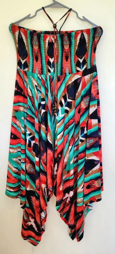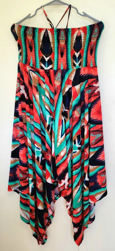 This patterned strapless halter dress features a unique design with vibrant colours. It's perfect for adding a pop of colour to your wardrobe and is in great condition.