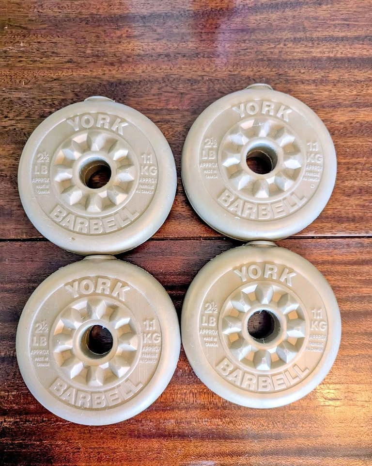 119Four York Barbells weighing 2.5 lb (1.1 kg) Vinyl weight plates, designed for use with barbells or dumbbells.