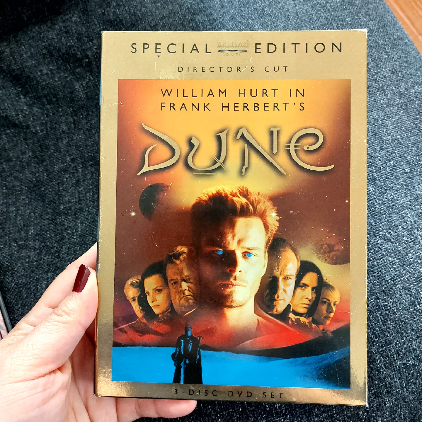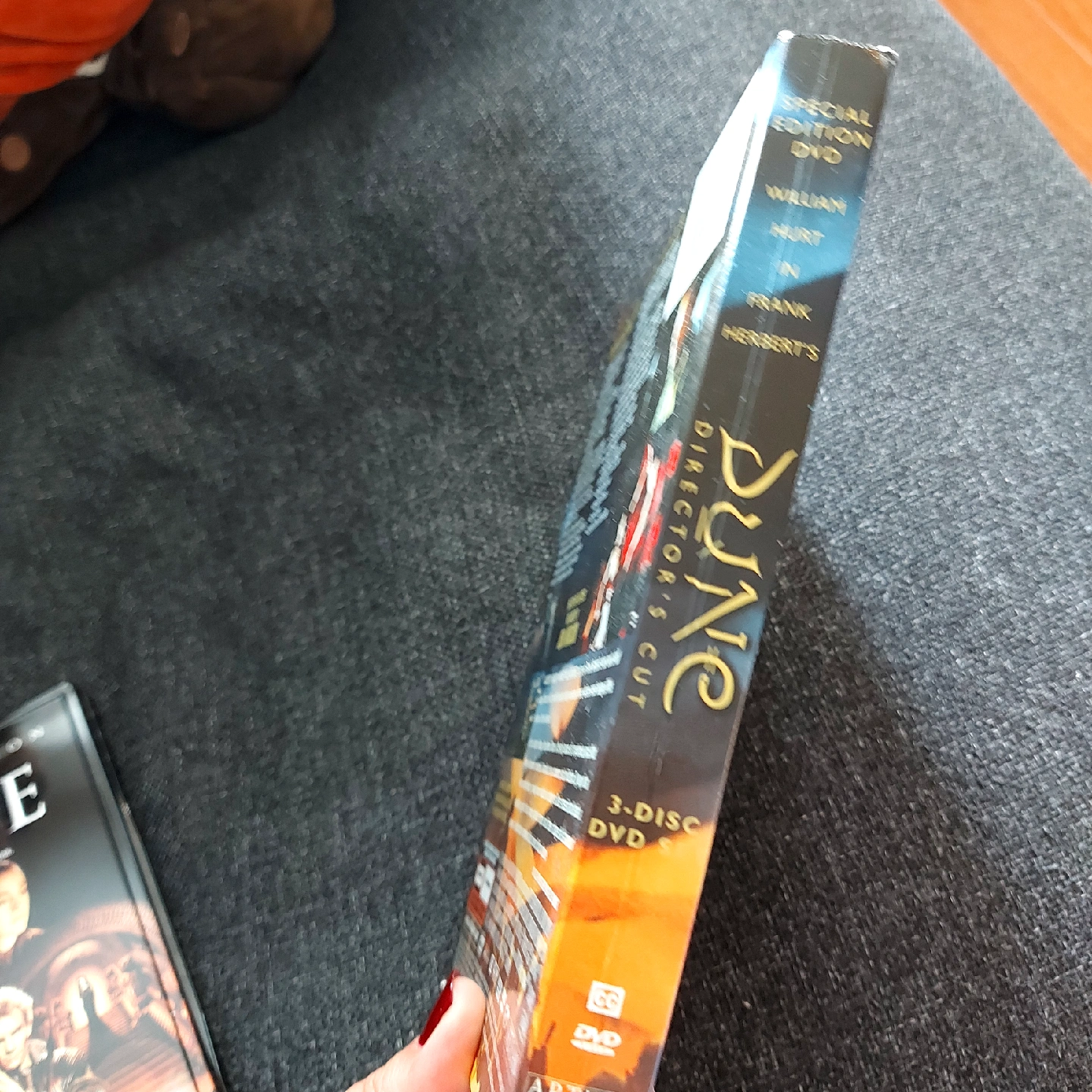 Special Edition Director's Cut of Dune on DVD.This 3-disc set features William Hurt in Frank Herbert's Dune. Crease in spine of the DVD case, plastic bit has detached from the case. Can be glued back on. Shows wear on case but discs are not scratched.