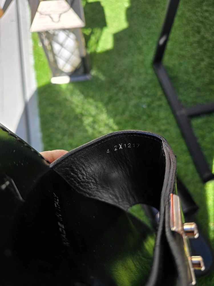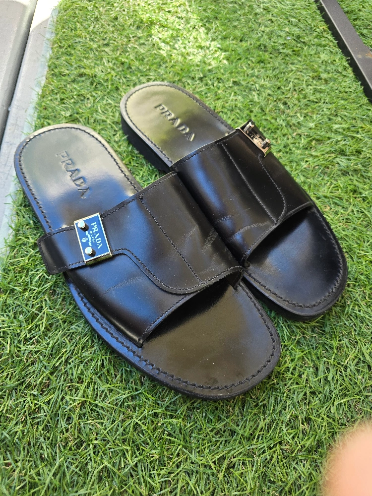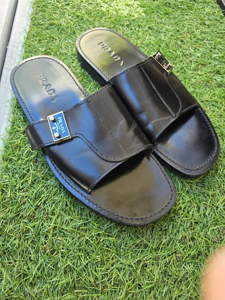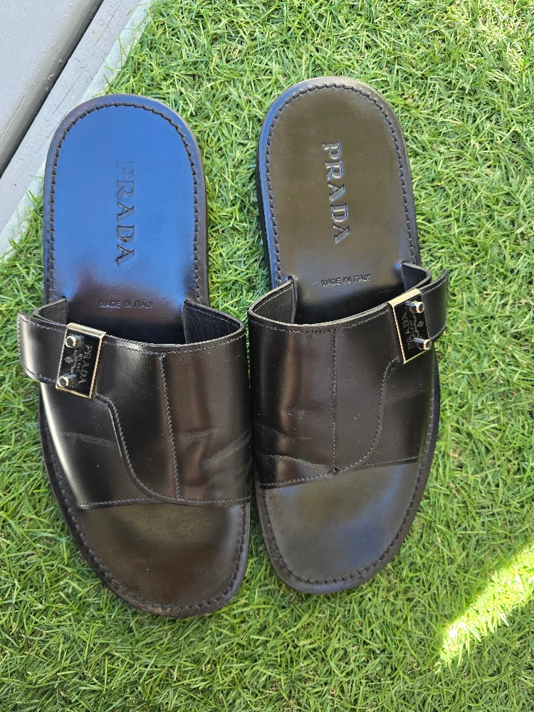 Selling a pair of Prada black leather slides. They are in good condition and a size 10 but feels like 10.5. The inside of the shoes have the number 4 and 2X1217.