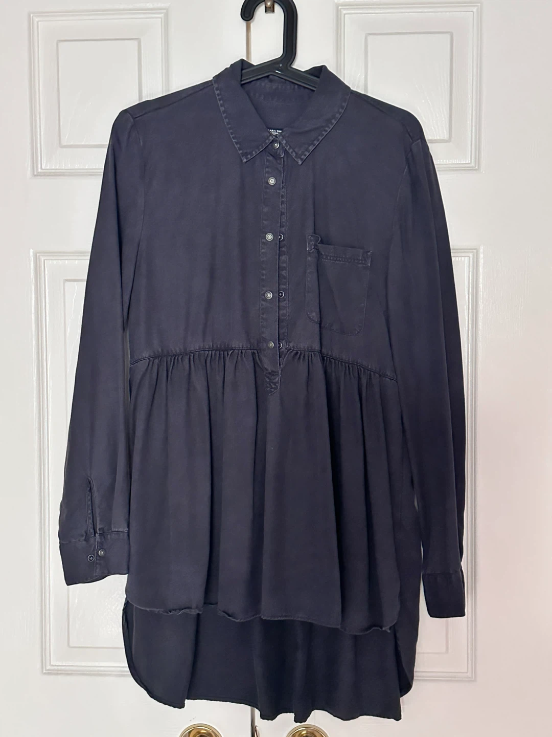 Selling a Zara navy blue tunic dress! It's in great condition and features a collared neckline, button-down front, and a cute, flowy silhouette. Perfect for a casual day out or dressed up with some accessories.