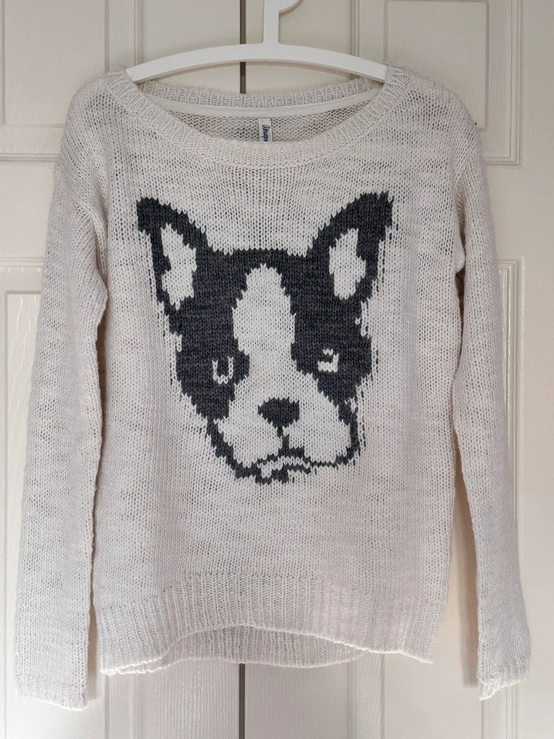 Cozy cream-coloured sweater from Aeropostale! It features a cute grey dog print on the front. Perfect for staying warm and stylish on cooler days. Tagged a size XS but fits oversized so suitable for S to M.