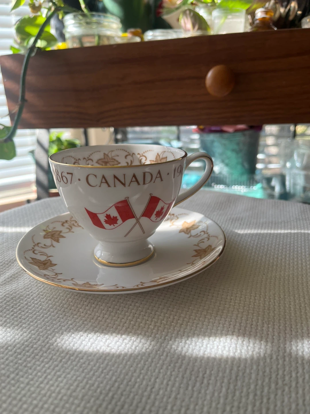 Royal Chelsea English Bone China cup and saucer commemorating Canada’s 1967 Centennial.