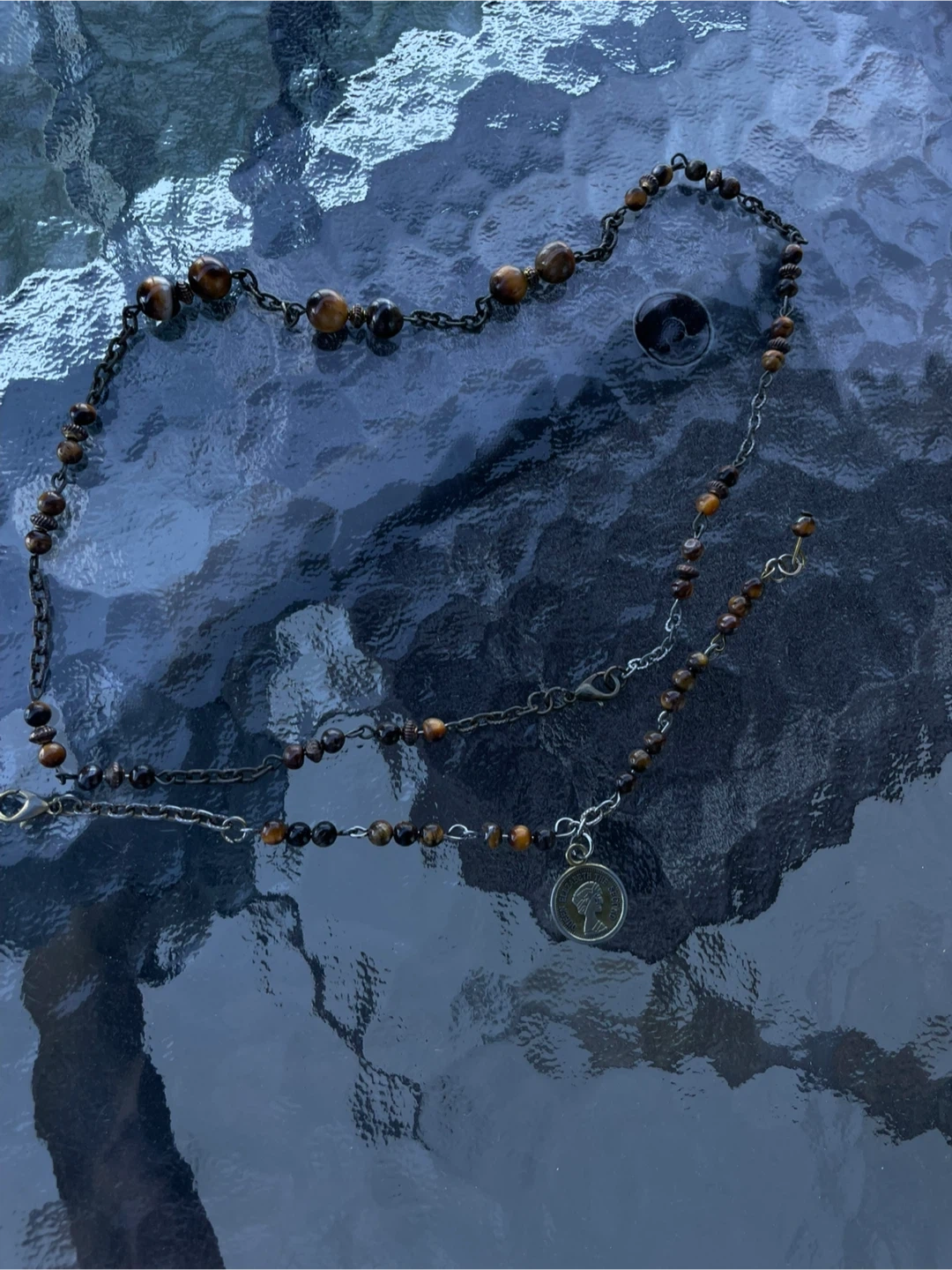 Here's a beaded necklace with tiger eye beads and a coin pendant. It has a cool, earthy vibe and would look great layered with other necklaces!