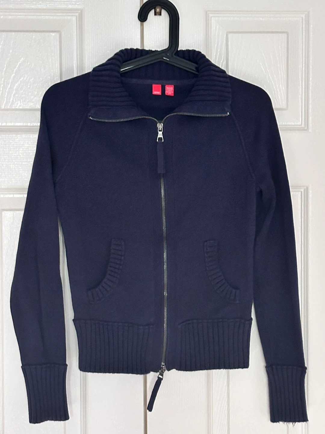 Selling an Esprit zip-up cardigan in navy blue. It features a ribbed collar, cuffs, and hem, along with two small front pockets. Perfect for layering!