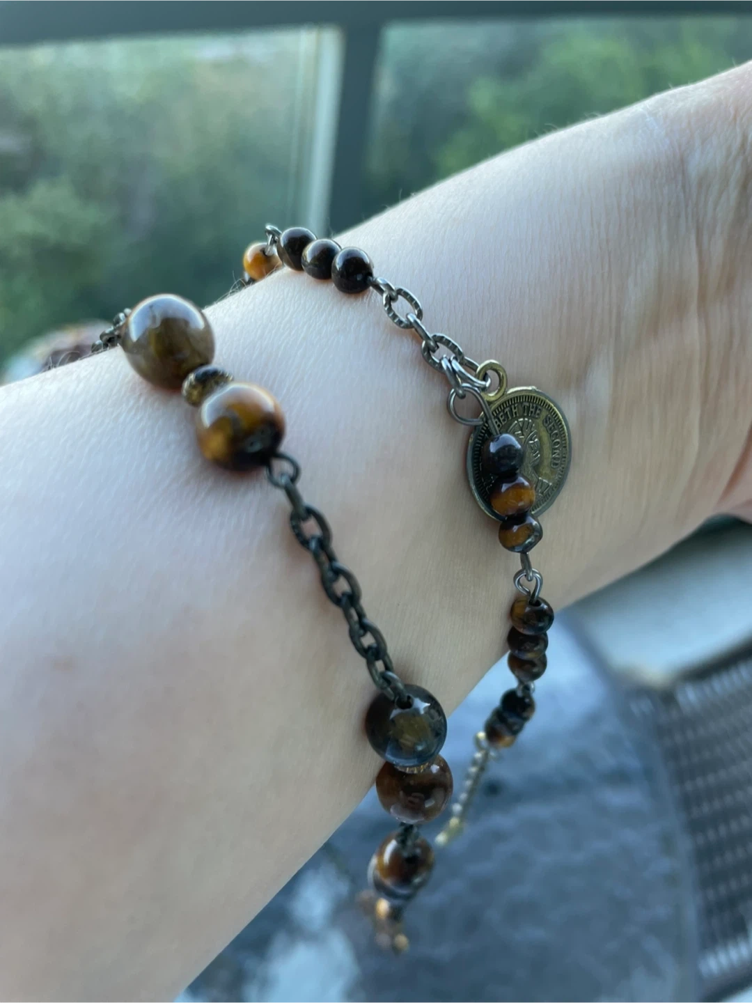 This is a beautiful tiger's eye beaded bracelet. It features a delicate chain and a coin charm for a unique touch. The beads have a lovely natural pattern. It's in great condition and ready to add some style to your wrist!