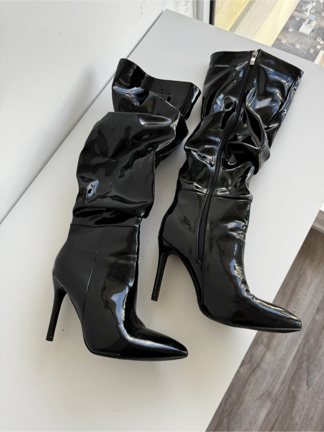 Selling a pair of black patent leather stiletto boots. They are in great condition and perfect for a night out. The boots feature a pointed toe and a stiletto heel, adding a touch of elegance to any outfit