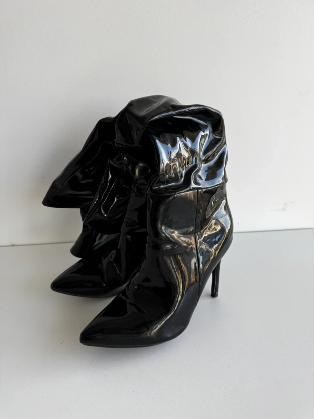 Selling a pair of black patent leather stiletto boots. They are in great condition and perfect for a night out. The boots feature a pointed toe and a stiletto heel, adding a touch of elegance to any outfit