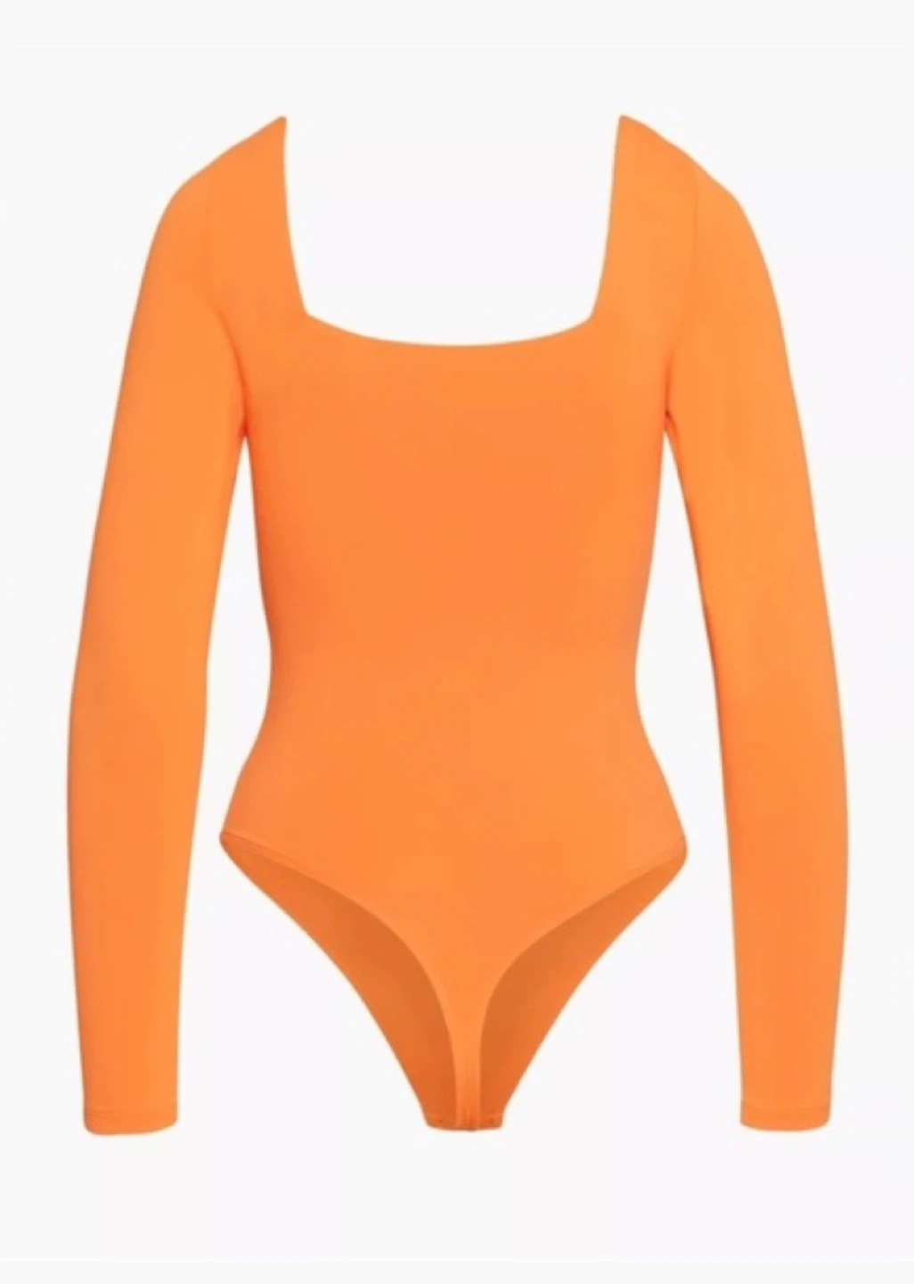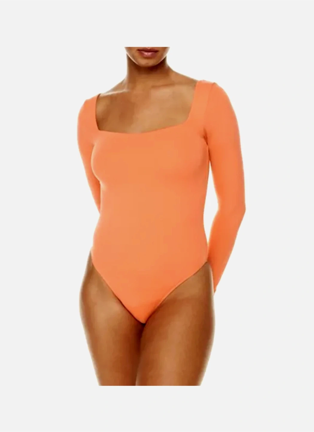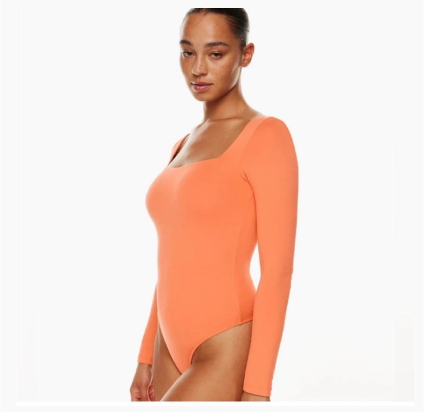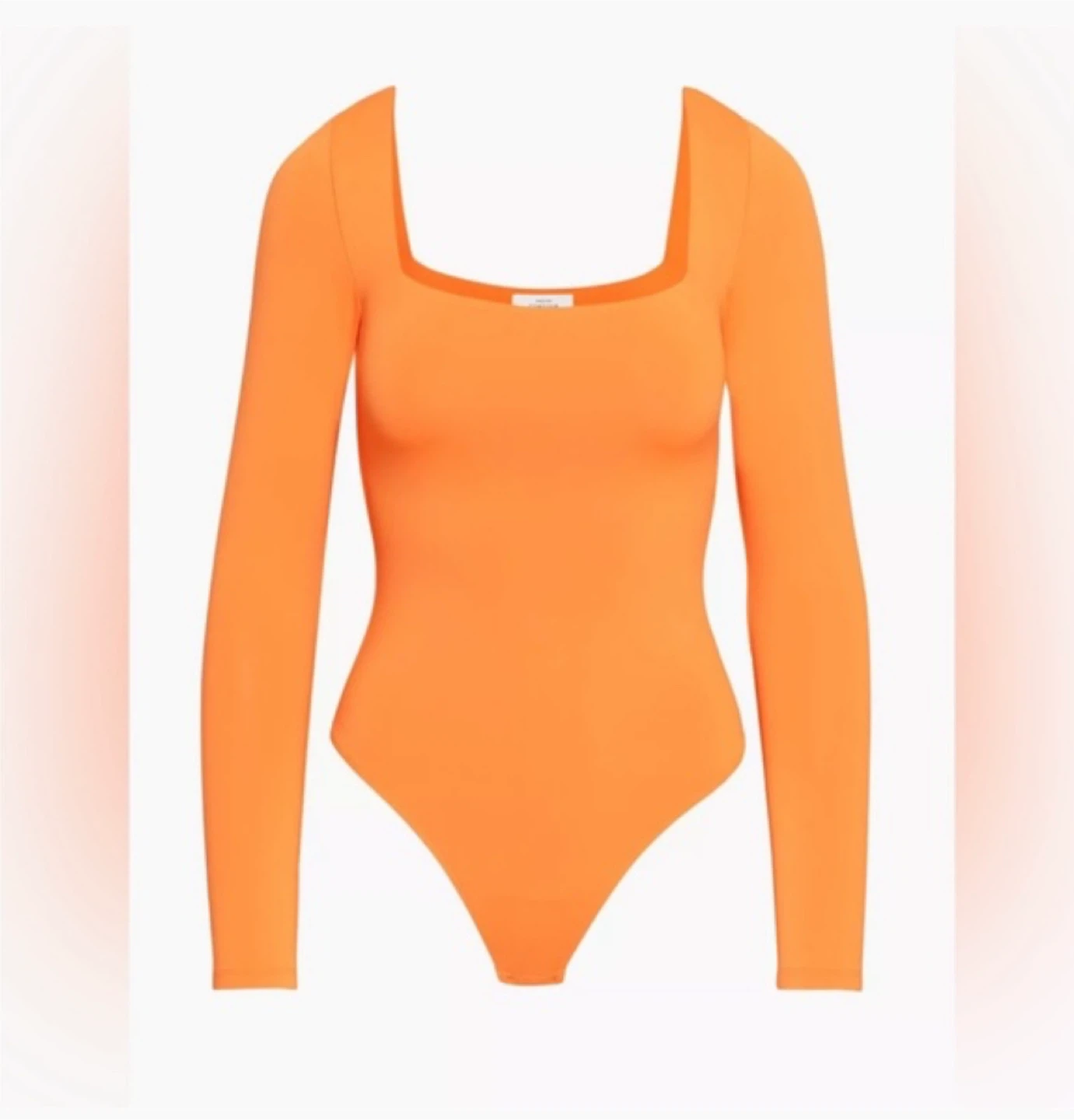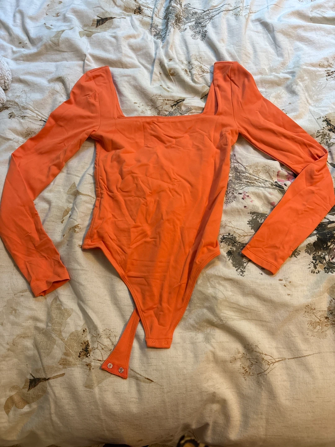 Selling a cute orange bodysuit with long sleeves! It has a square neckline and snap closure at the bottom. Great for layering or wearing on its own. Never worn. Brand new. Retails for $58.