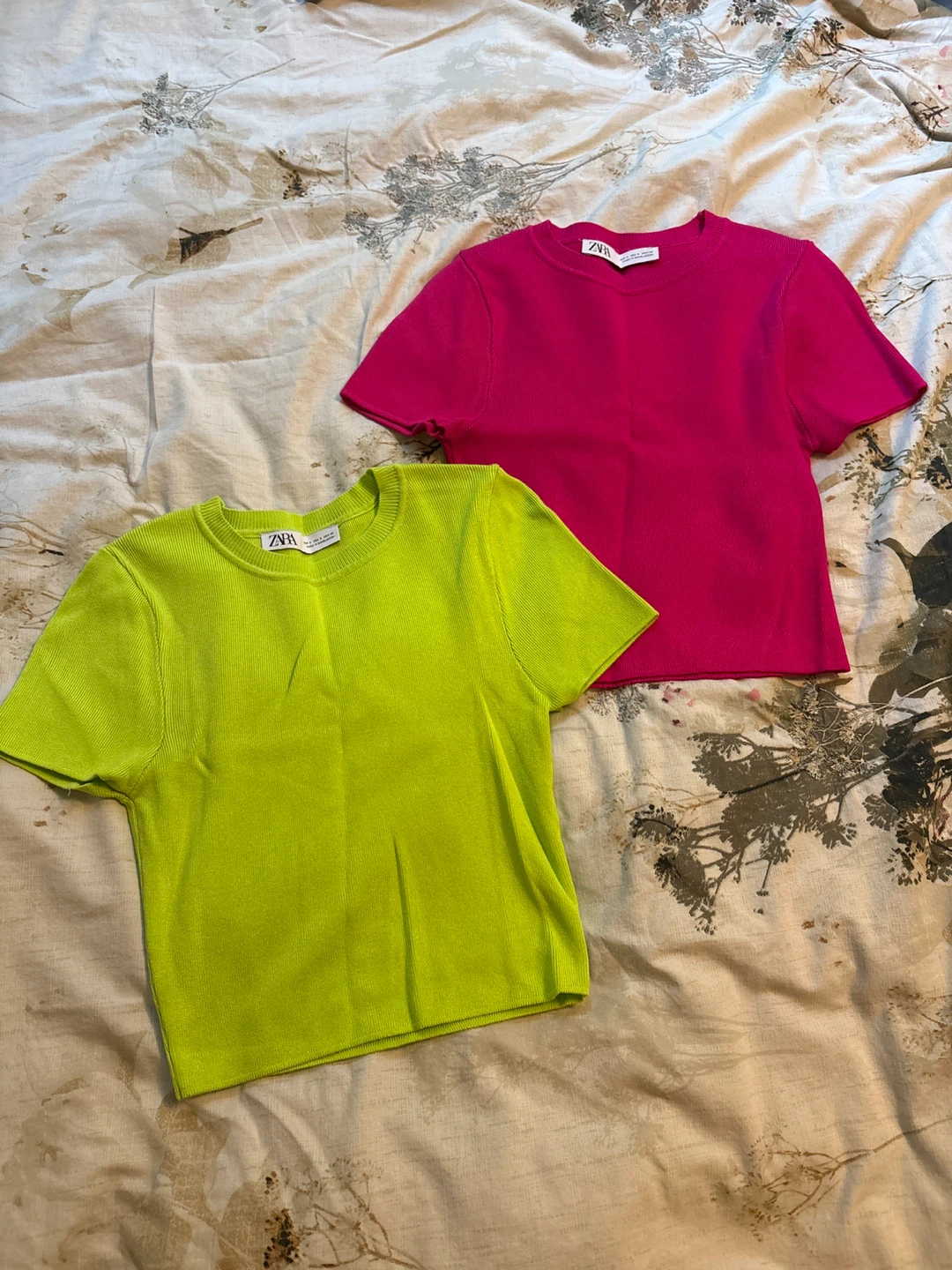 Selling two Zara knit crop tops. One is a vibrant pink and the other is a bright neon green. They're both in great condition and perfect for adding a pop of colour to your wardrobe. $10 each.