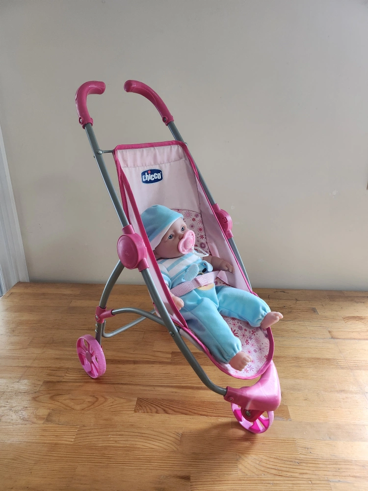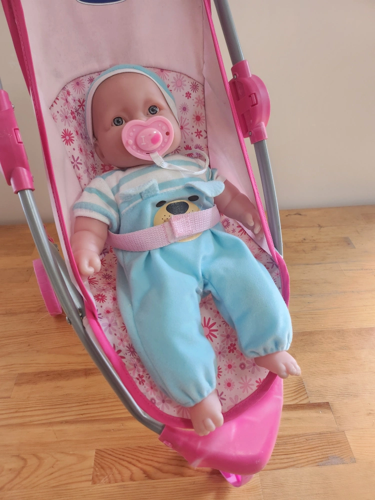 A cute baby doll with a blue outfit and a matching hat is ready for a new home! It comes with a pink pacifier and a pink stroller. Perfect for imaginative play!