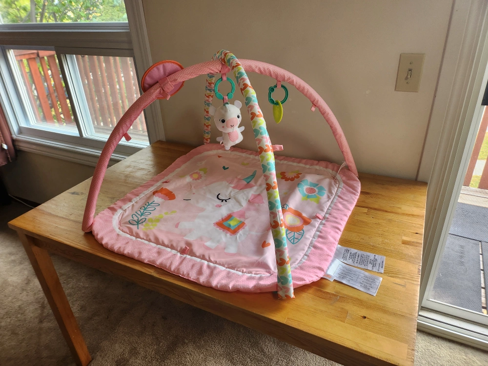 This Bright Starts activity gym is perfect for your little one! It features a cute unicorn design and includes a play mat, overhead arch, and hanging toys to keep baby entertained.