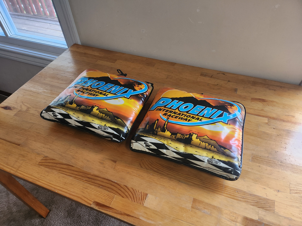 A pair of Phoenix International Raceway seat cushions. They feature a vibrant desert landscape design with the track name prominently displayed. The cushions have a black and white checkered pattern around the edges.