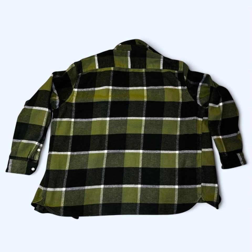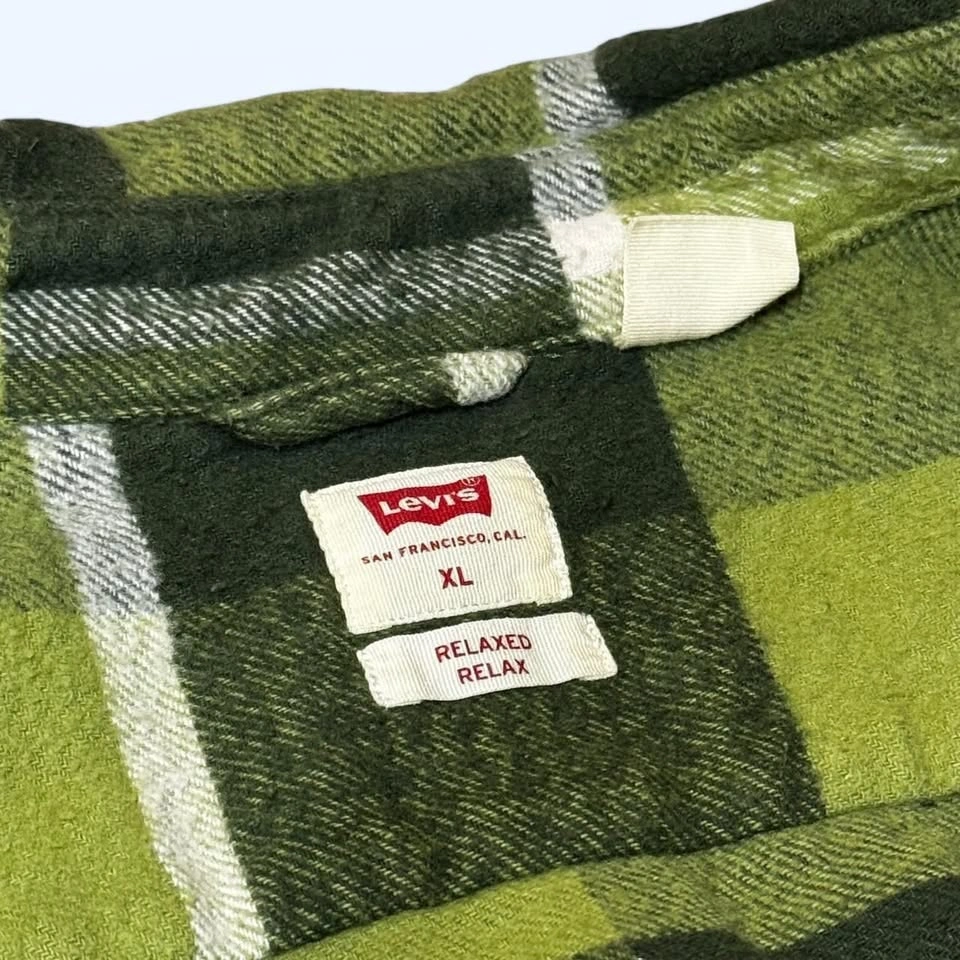 65Classic Levi's flannel in a green and black plaid pattern. Relaxed fit, soft material, and button-up front. Size XL. Great for layering or wearing on its own.