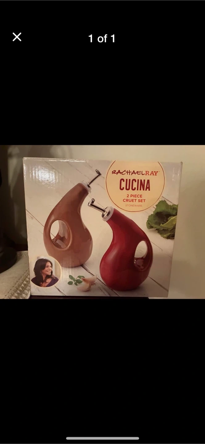 Selling a Rachael Ray Cucina 2-Piece Cruet Set! This set is made of stoneware and includes two cruets, perfect for oil and vinegar. The set comes in its original box.