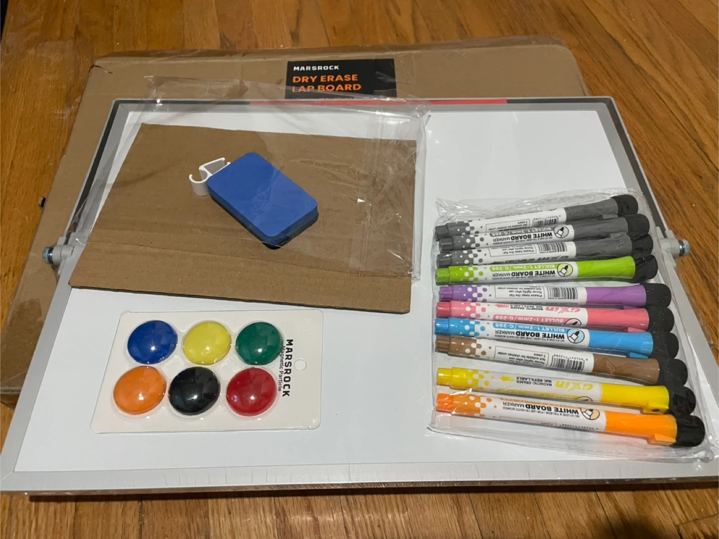 Selling a Marsrock dry erase lap board, still in its original packaging! It comes with a variety of colourful markers, a magnetic eraser, and magnets. Perfect for kids or anyone who needs a portable whiteboard for brainstorming or doodling