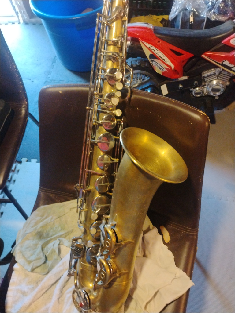 Selling a used saxophone. It shows some signs of wear and could use a cleaning, but it's still in good working condition for someone looking to learn or practice!