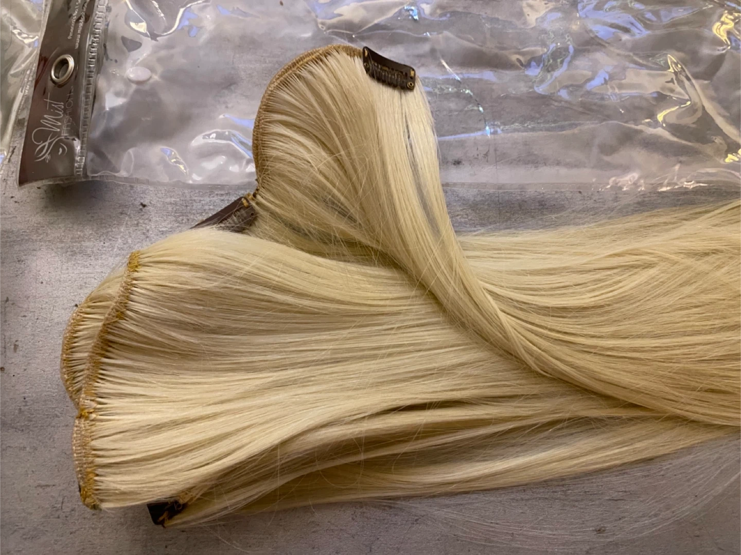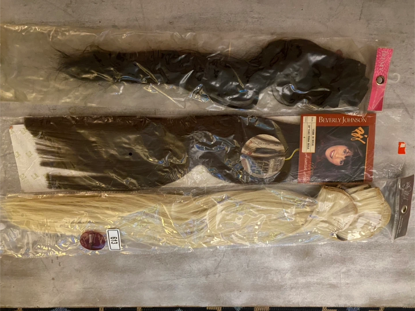 Selling a variety of hair extensions! There's Mist Fashion, Remy, and Beverly Johnson available. The blonde extensions are 100% Futura fiber and safe up to 369°F
