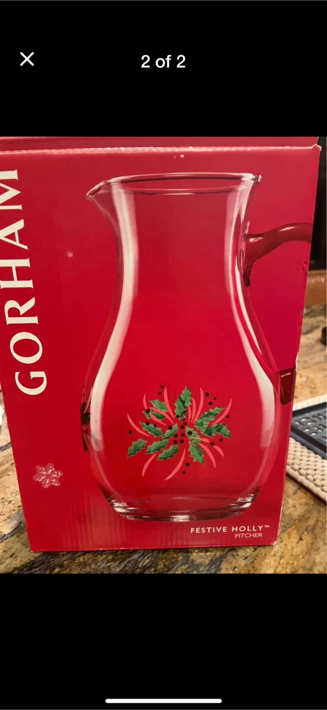 Selling a Gorham Festive Holly Pitcher! It comes with the box, making it perfect for gifting or adding to your holiday collection. The pitcher features a beautiful holly design, adding a touch of festive cheer to any table setting