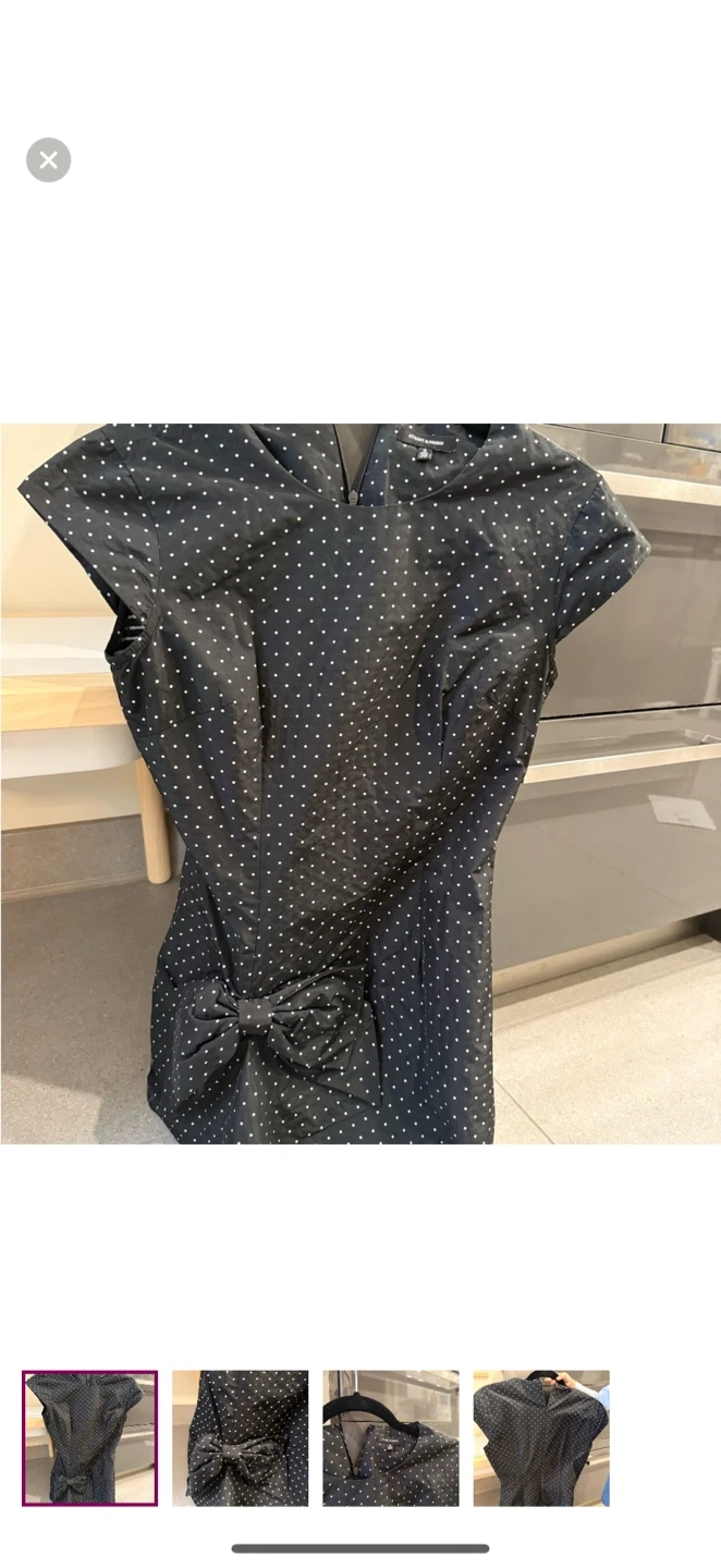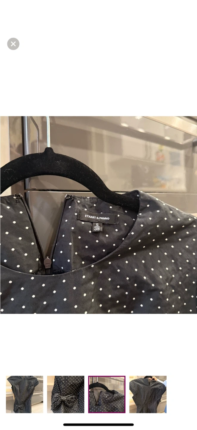 This chic black dress features a classic polka dot pattern, perfect for any occasion. Its elegant design is both timeless and versatile. I am 5 ft 2 and wore this as a mini dress with tights. Can be worn as a top if you are taller :) Size 38 European which corresponds to US S