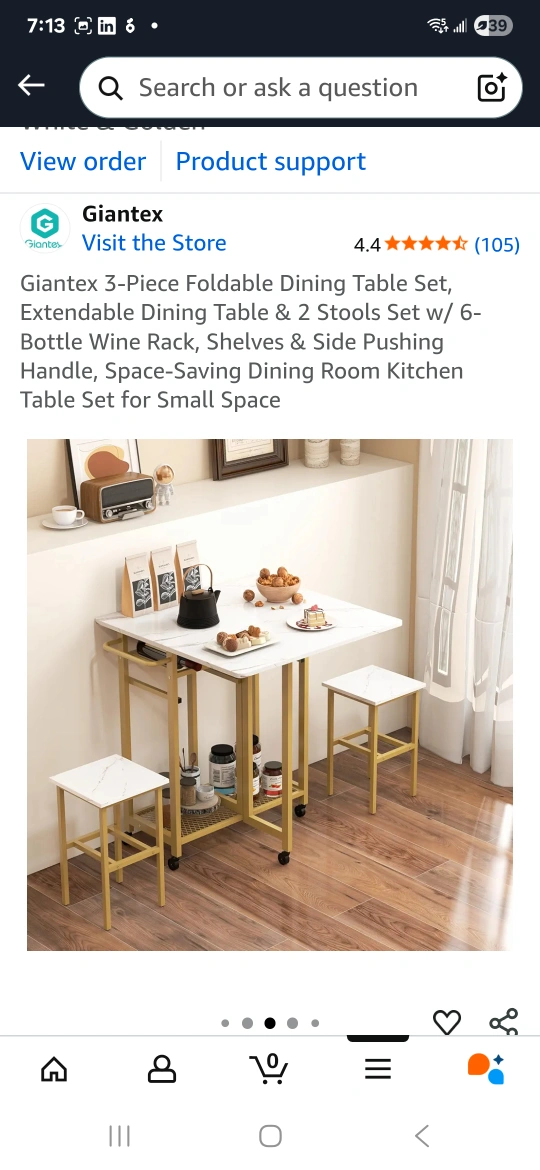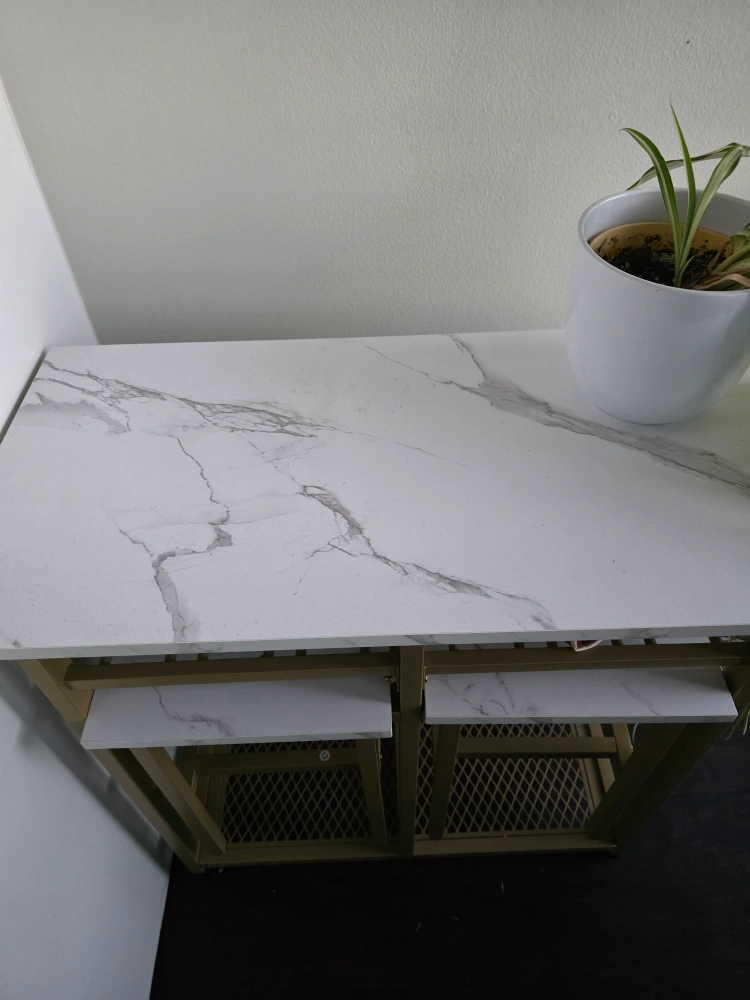 It's a new 3-Piece Foldable Dining Table Set with 2 Stools. This extendable dining table features a 6-bottle wine rack, shelves, and a side pushing handle, includes PP universal wheels and 2 lockable wheels for stability and easy movement. Bought it in March for $192 and not has been used since then, now selling because I'm moving out of city and I will no longer need this. It's brand new piece and the installation took decent time, which was built in a sturdy way.