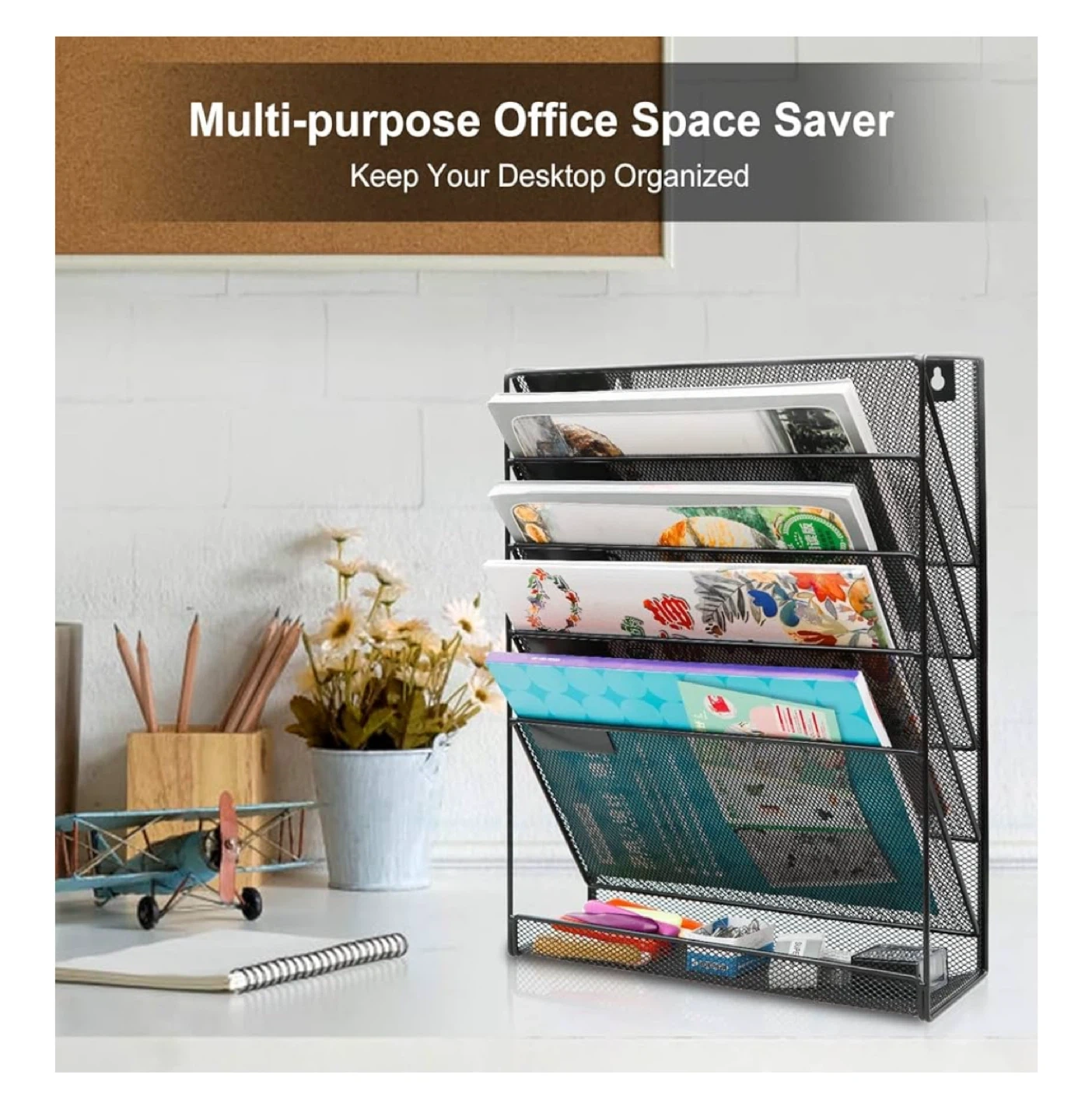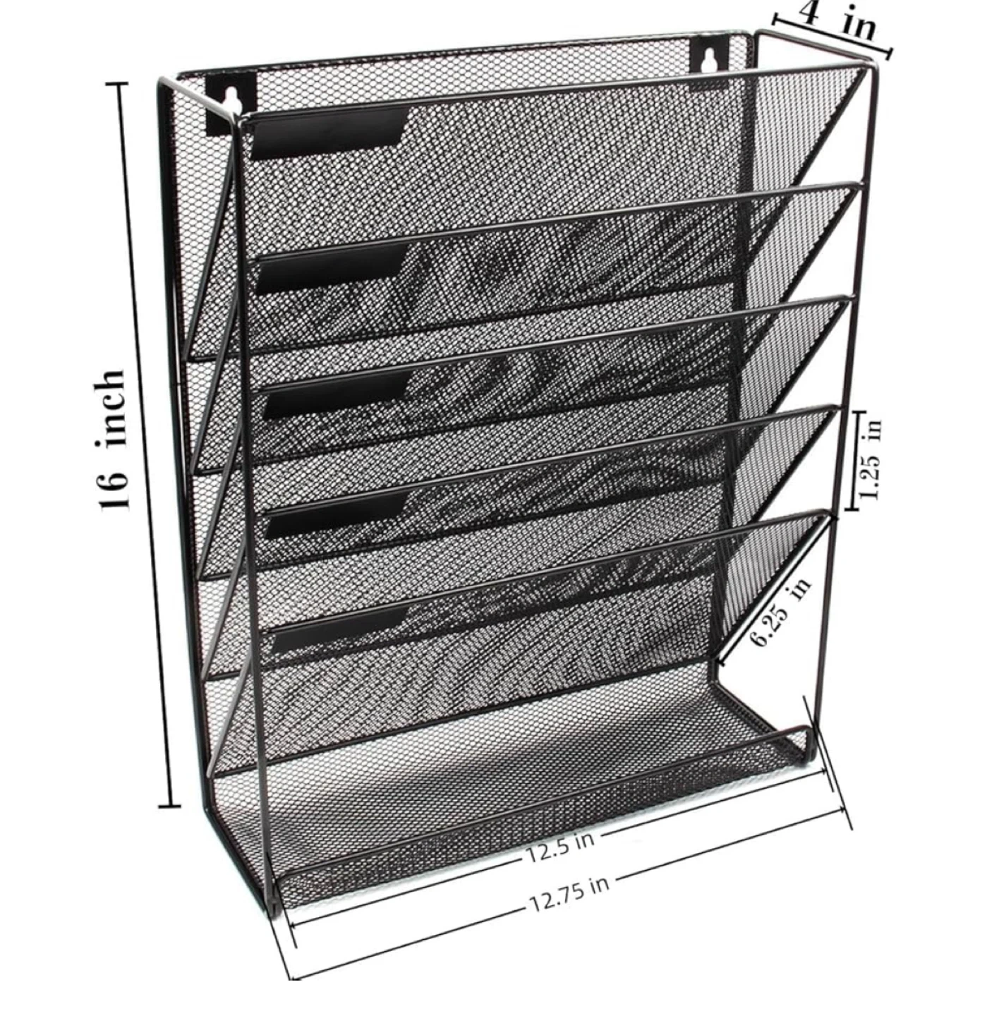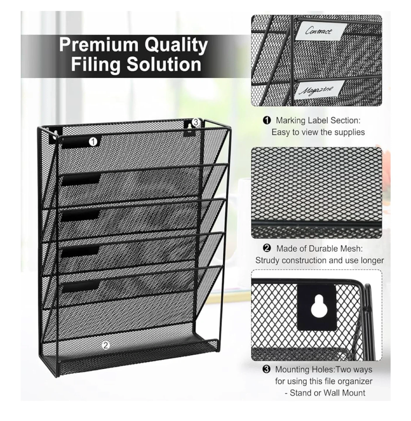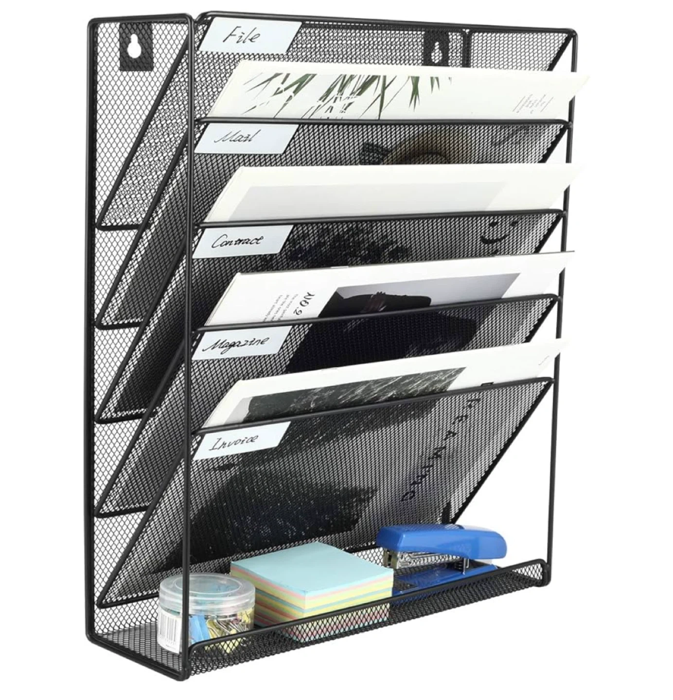 Keep your space tidy with this black mesh file organizer! It's perfect for keeping your desktop organized, whether you choose to stand it on your desk or mount it on the wall. It's made of durable mesh, so it's sturdy and built to last. The organizer features multiple sections for easy viewing and labeling of your supplies
