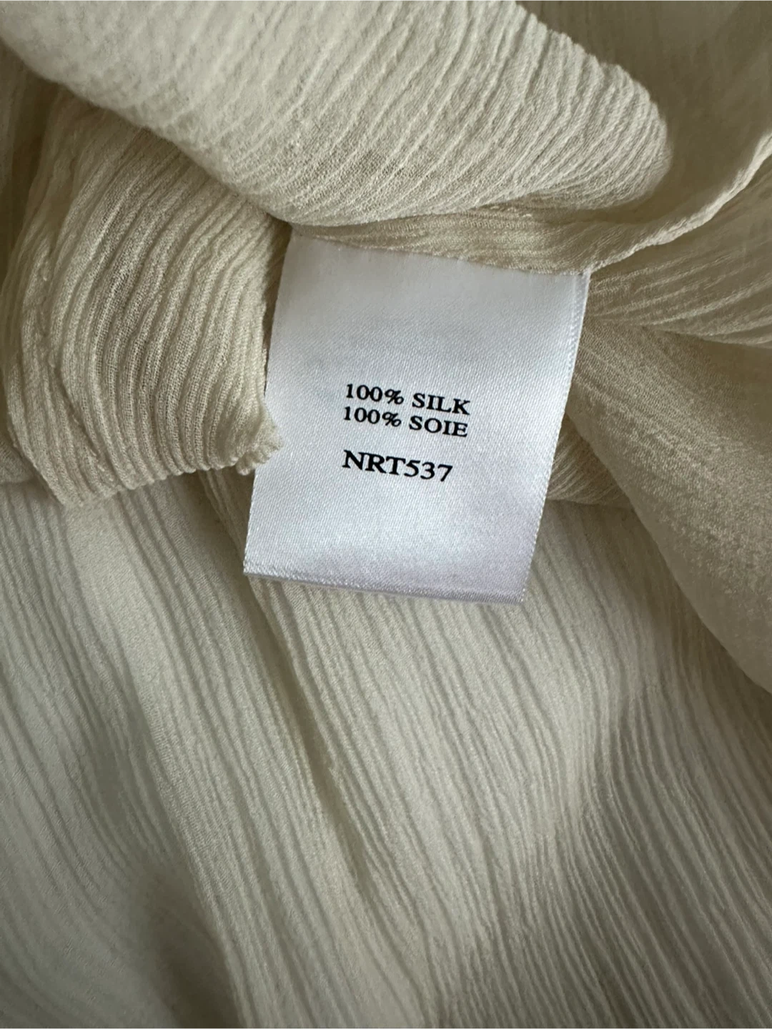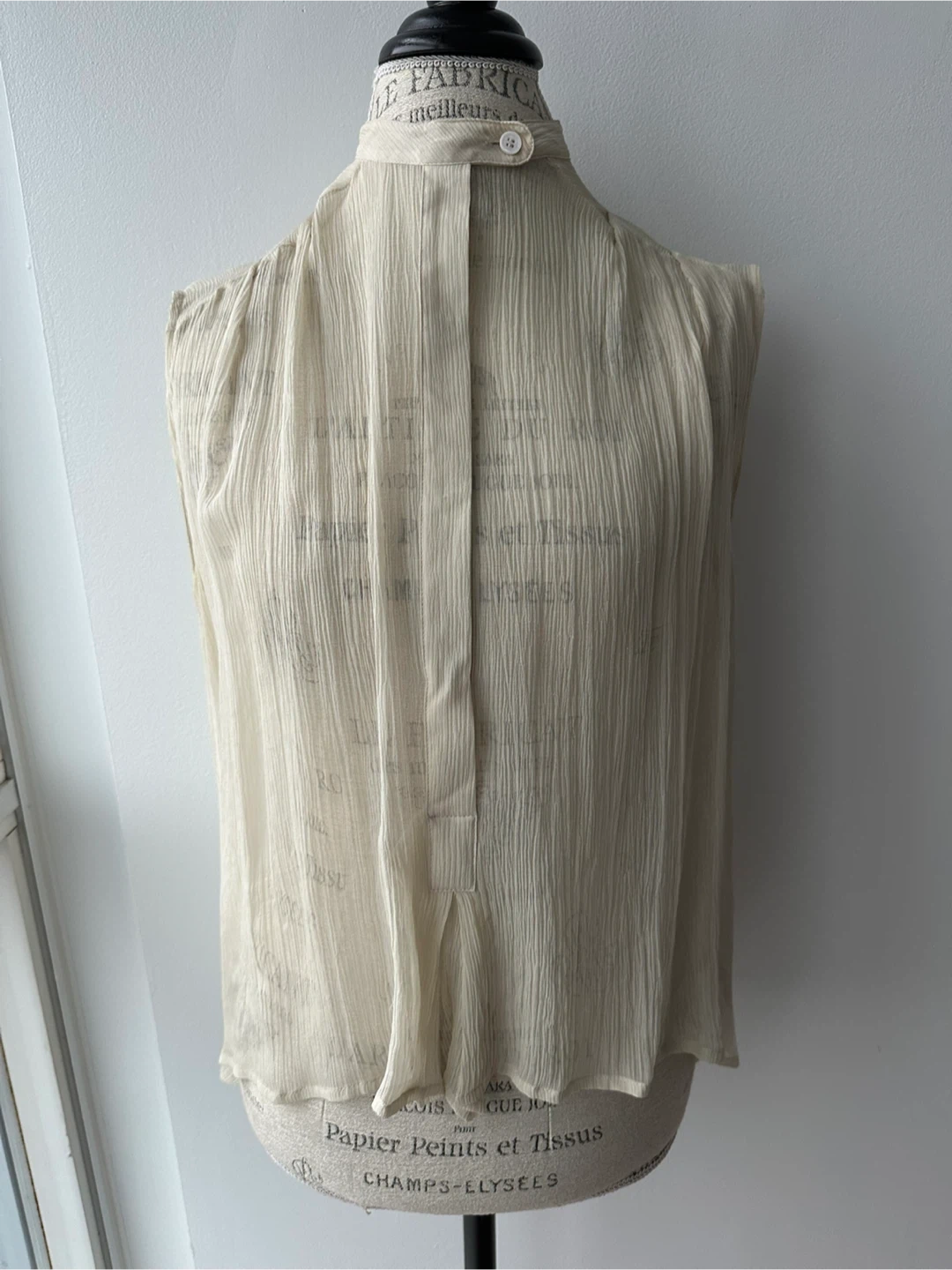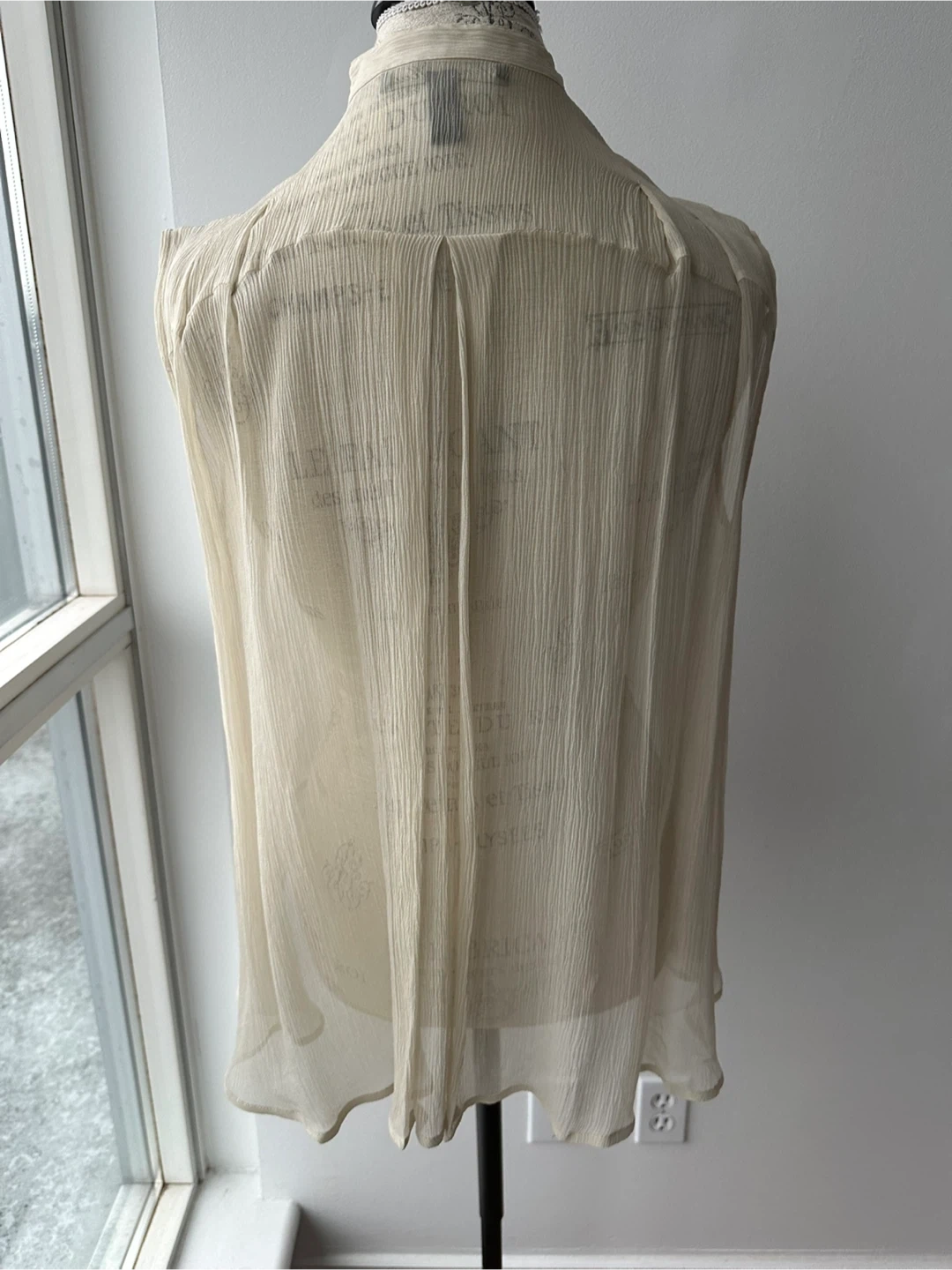 A sheer silk sleeveless blouse that is perfect for layering. It's a beautiful cream colour and in great condition. This drapes beautifully on the body with the high low hem and it’s relaxed fit. There are delicate and feminine pleats on the shoulder and in the back. A great compliment to any wardrobe! Length: high ~21 inches / low ~ 26 inches