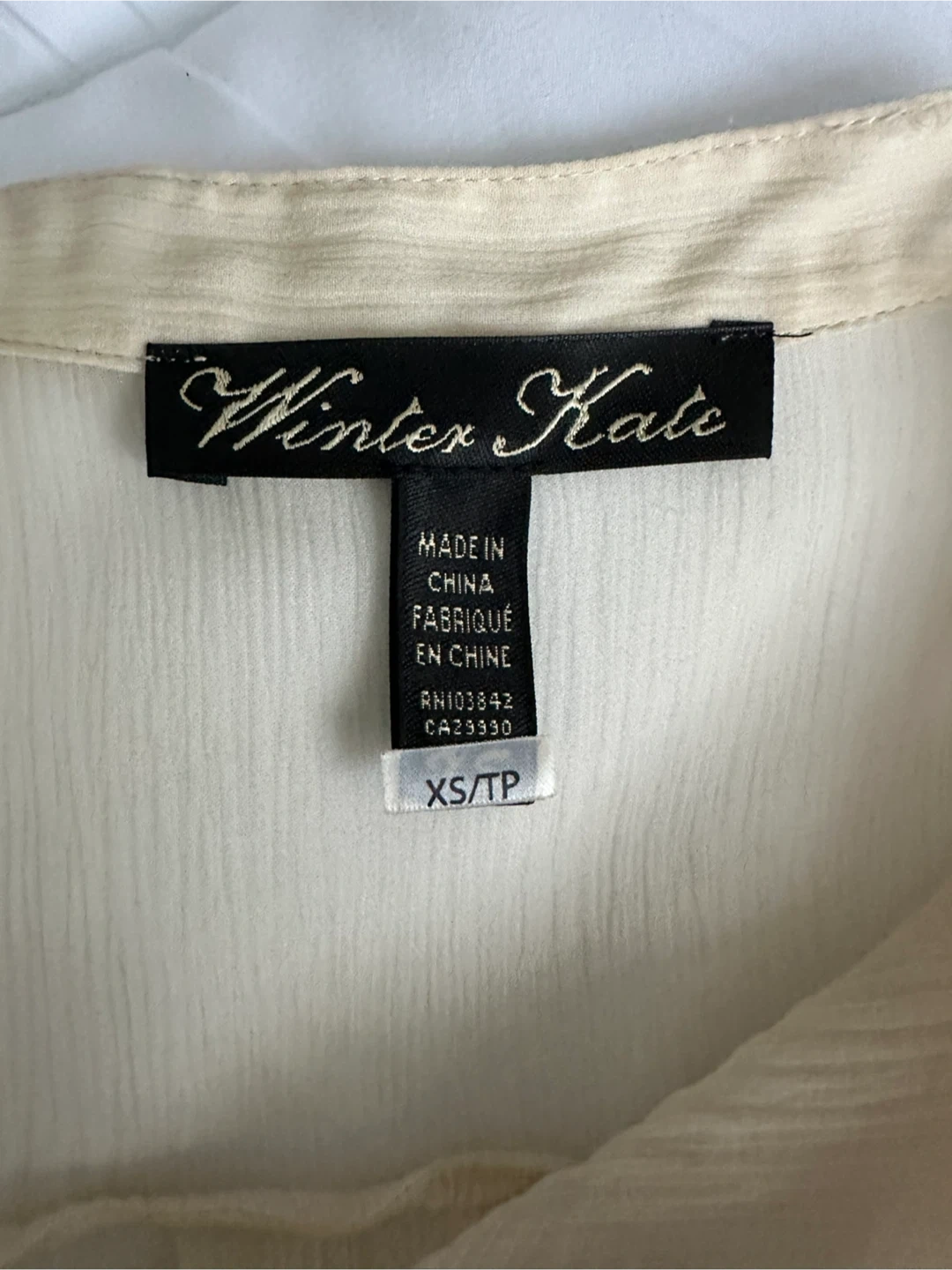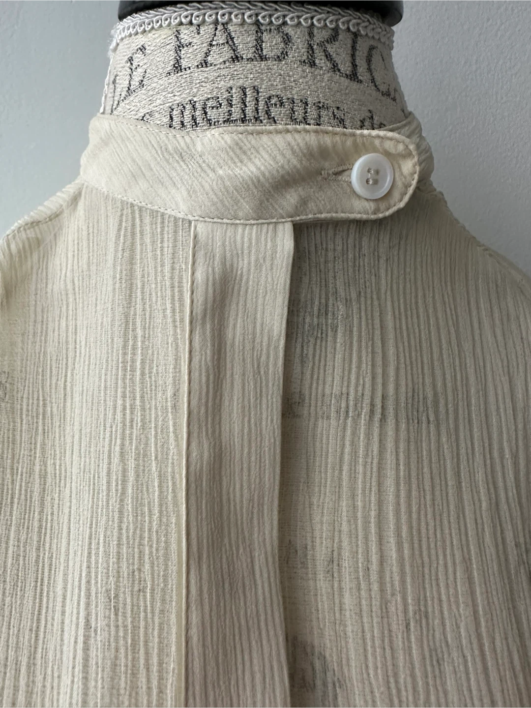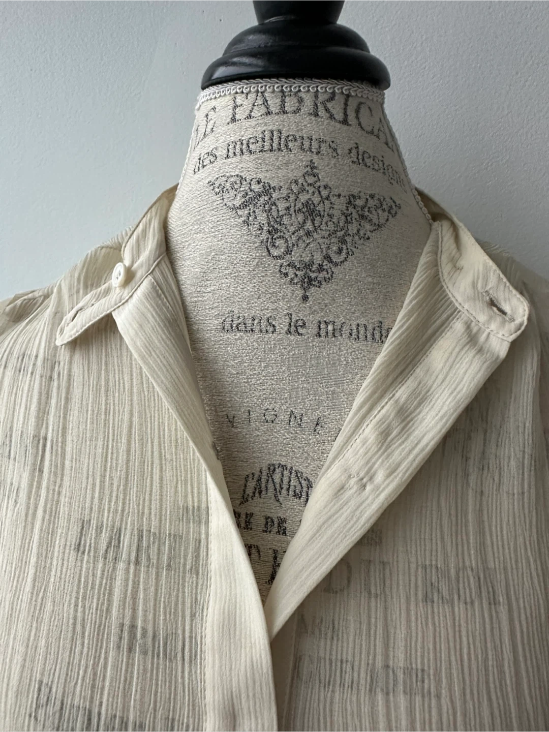 A sheer silk sleeveless blouse that is perfect for layering. It's a beautiful cream colour and in great condition. This drapes beautifully on the body with the high low hem and it’s relaxed fit. There are delicate and feminine pleats on the shoulder and in the back. A great compliment to any wardrobe! Length: high ~21 inches / low ~ 26 inches